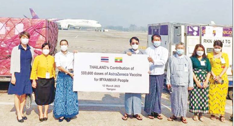 ကိုဗစ်-၁၉ ရောဂါ ကာကွယ်ဆေးထိုးလုပ်ငန်းများတွင် အသုံးပြုရန် ထိုင်းနိုင်ငံမှ မြန်မာနိုင်ငံ ပြည်သူများသို့ မြန်မာနိုင်ငံ ကြက်ခြေနီအသင်းမှ တစ်ဆင့် လှူဒါန်းသည့် ကိုဗစ်-၁၉ ကာကွယ်ဆေး AstraZeneca အမှတ်တံဆိပ် တစ်သန်း doses အနက် ပထမအသုတ် ကာကွယ်ဆေး ငါးသိန်း Doses နှင့် ဆေးထိုးအပ် ငါးသိန်းအား မြန်မာနိုင်ငံကြက်ခြေနီအသင်းသို့ လွှဲပြောင်းပေးအပ်ပွဲကို ယနေ့ နံနက်ပိုင်းက ရန်ကုန်အပြည်ပြည်ဆိုင်ရာ လေဆိပ်ဧည့်ခန်းမဆောင်၌ ပြုလုပ်သည်။