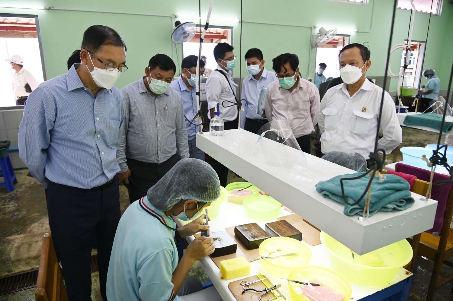 ထို့နောက် ပြည်ထောင်စုဝန်ကြီးသည် ဘုတ်ပြင်းမြို့နယ် ဒိုမယ်ကျွန်းစခန်းတွင် ပုလဲထုတ်လုပ်မှု လုပ်ငန်းအဆင့်ဆင့်ကို ကြည့်ရှုစစ်ဆေးပြီး လိုအပ်သည်များကို ပေါင်းစပ်ညှိနှိုင်း ဖြည့်ဆည်းပေးသည်။ ယင်းနောက် ဇင်ယော်ကျွန်းရှိ မွေးမြူရေး ရေပြင်တွင် Surface Long Line System ဖြင့် မုတ်ကောင်မွေးမြူထားမှုကို ကြည့်ရှုစစ်ဆေးခဲ့ကြောင်း သိရသည်။