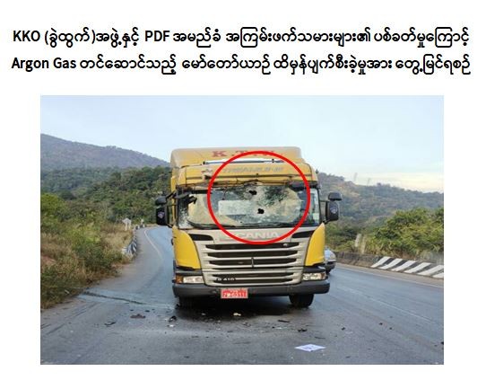 အလားတူ မြဝတီမြို့မှ မန္တလေးမြို့သို့ပို့ဆောင်ရန် Argon Gas အရည်များ တင်ဆောင်ထွက်ခွာလာ သည့် ဦးထွန်းမင်းဦး(ဘ) ဦးကိုမြင့် မောင်းနှင်ပြီး ရဲထွေးအောင်(ဘ)ဦးဝင်းထူး လိုက်ပါလာသော မော်တော်ယာဉ်သည် ဇန်နဝါရီလ ၁၁ ရက် ညနေ ၄ နာရီခွဲခန့်တွင် ကော့ကရိတ်မြို့နယ်၊ တတန်ကူး ကျေးရွာ၏ အရှေ့မြောက်ဘက် မီတာ ၃၀၀၀ ခန့် အကွာသို့ရောက်ရှိစဉ် PDF အမည်ခံအကြမ်းဖက် သမားများက လက်နက်ငယ်များဖြင့် အကြောင်းမဲ့ပစ်ခတ်ခဲ့ရာ မော်တော်ယာဉ် လေကာမှန်နှင့် ကားဘီးများ လက်နက်ငယ်ကျည်ထိမှန် ပျက်စီးခဲ့ရသည်။