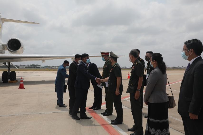 ထို့နောက် မြန်မာ့တပ်မတော် ကိုယ်စားလှယ်အဖွဲ့သည် ကမ္ဘောဒီးယားနိုင်ငံ၊ ဖနောင်ပင်မြို့သို့ ဒေသစံတော်ချိန်နံနက် ၁၁ နာရီတွင် ရောက်ရှိကြရာ ကမ္ဘောဒီးယား ဘုရင့်တပ်မတော် ဒုတိယစစ်ဦးစီးချုပ်၊ သုတေသနနှင့် ထောက်လှမ်းရေးဌာန ညွှန်ကြားရေးမှူး Lieutenant General. Hann Sovann နှင့်တာဝန်ရှိသူများ ကမ္ဘောဒီးယားနိုင်ငံဆိုင်ရာ မြန်မာနိုင်ငံသံအမတ်ကြီး ဦးသစ်လင်းဦး၊ မြန်မာစစ်သံ (ကြည်း၊ ရေ၊ လေ) ဗိုလ်မှူးချုပ် သူရလှမင်းနှင့် ကမ္ဘောဒီးယားနိုင်ငံမှ တာဝန်ရှိသူများက လေဆိပ်တွင် ကြိုဆိုနှုတ်ဆက်ခဲ့ကြကြောင်း သတင်းရရှိသည်။