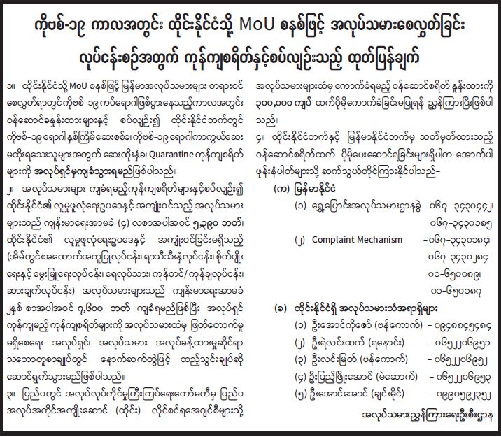 ကိုဗစ်-၁၉ ကာလအတွင်း ထိုင်းနိုင်ငံသို့ MoU စနစ်ဖြင့် အလုပ်သမားစေလွှတ်ခြင်း လုပ်ငန်းစဉ်အတွက် ကုန်ကျစရိတ်နှင့်စပ်လျဉ်းသည့် ထုတ်ပြန်ချက် 03/15/2022 ကိုဗစ်-၁၉ ကာလအတွင်း ထိုင်းနိုင်ငံသို့ MoU စနစ်ဖြင့် အလုပ်သမားစေလွှတ်ခြင်း လုပ်ငန်းစဉ်အတွက် ကုန်ကျစရိတ်နှင့်စပ်လျဉ်းသည့် ထုတ်ပြန်ချက်