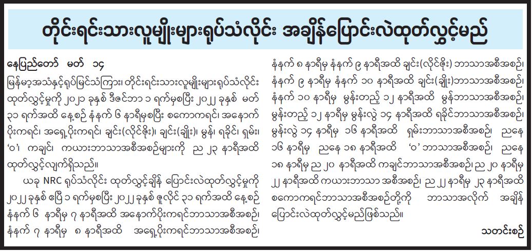 တိုင်းရင်းသားလူမျိုးများရုပ်သံလိုင်း အချိန်ပြောင်းလဲထုတ်လွှင့်မည်