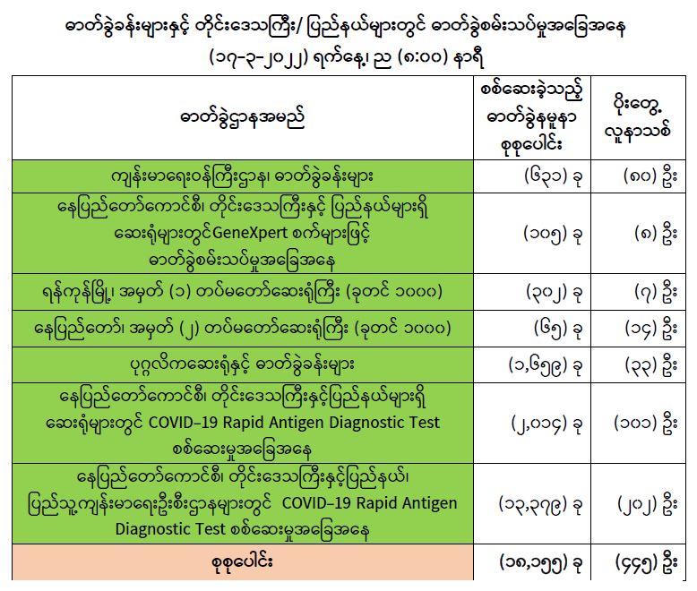 သို့ဖြစ်ပါ၍ ယနေ့အထိ ဓာတ်ခွဲနမူနာစုစုပေါင်း(၇,၄၅၅,၃၆၈) ခုအားစစ်ဆေးခဲ့ပြီး COVID-19 ဓာတ်ခွဲအတည်ပြုလူနာ စုစုပေါင်း (၆၀၇,၈၄၄) ဦး ရှိပြီ ဖြစ်ပါသည်။
