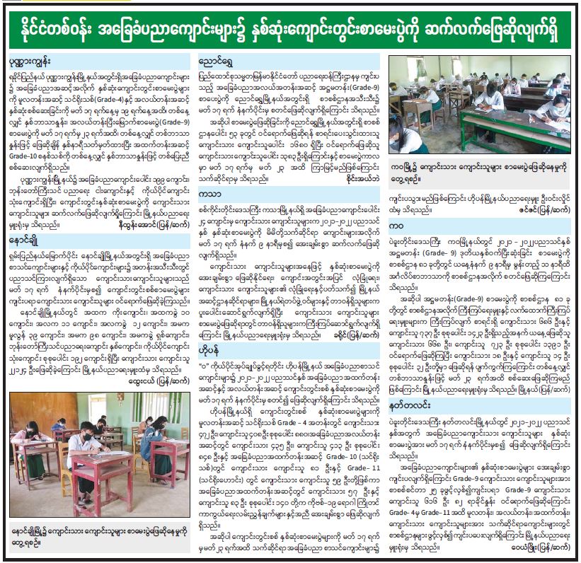 နိုင်ငံတစ်ဝန်း အခြေခံပညာကျောင်းများ၌ နှစ်ဆုံးကျောင်းတွင်းစာမေးပွဲကို ဆက်လက်ဖြေဆို လျက်ရှိ