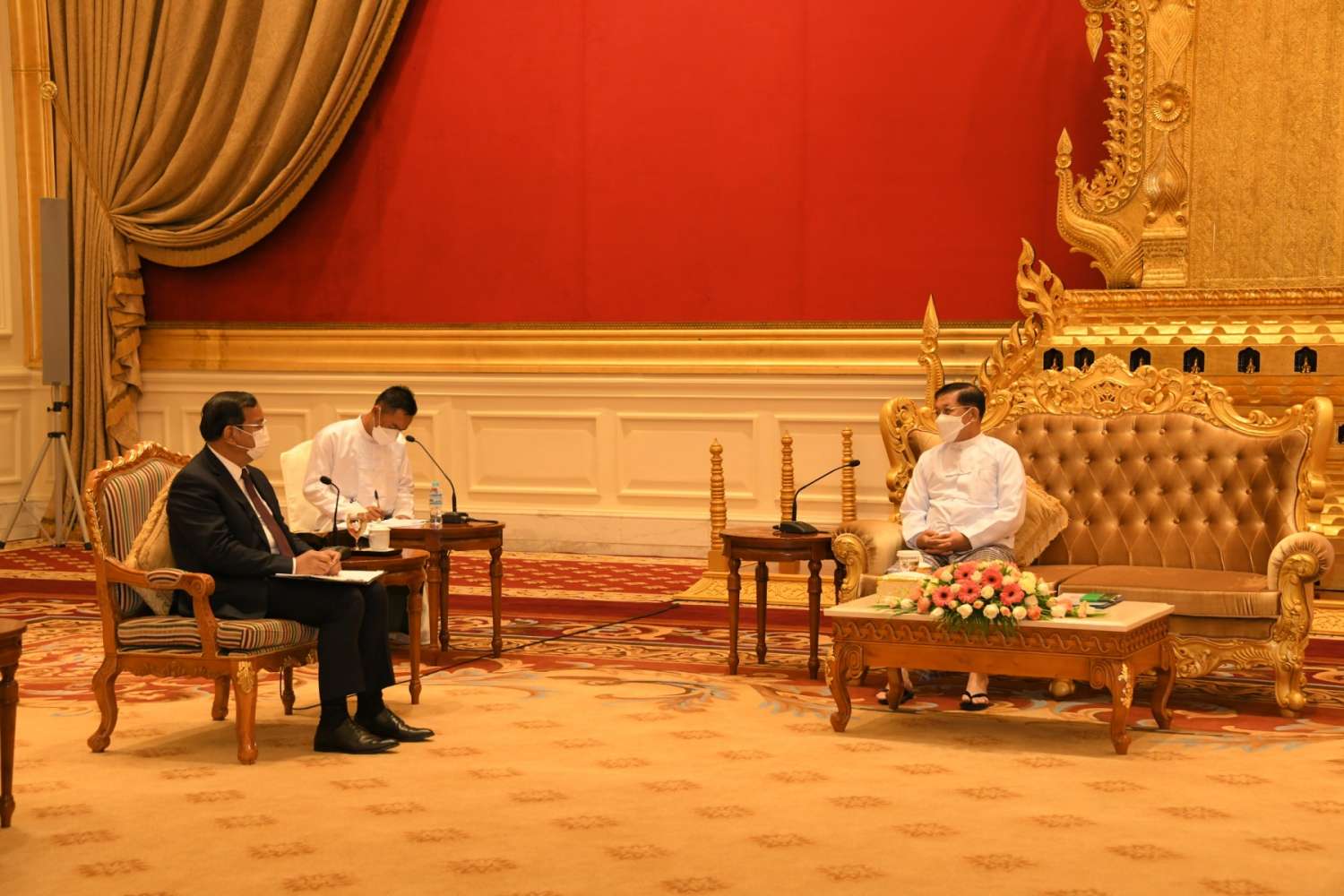နိုင်ငံတော်စီမံအုပ်ချုပ်ရေးကောင်စီဥက္ကဋ္ဌ နိုင်ငံတော်ဝန်ကြီးချုပ် ဗိုလ်ချုပ်မှူးကြီးမင်းအောင်လှိုင် အာဆီယံအလှည့်ကျဥက္ကဋ္ဌ၏ မြန်မာနိုင်ငံဆိုင်ရာအထူးကိုယ်စားလှယ် ကမ္ဘောဒီးယားနိုင်ငံ ဒုတိယဝန်ကြီးချုပ် H.E. Mr. Prak Sokhonn နှင့် အာဆီယံ အတွင်းရေးမှူးချုပ် H.E. Dato Lim Jock Hoi တို့အား ယနေ့နံနက် ၁၀ နာရီခွဲတွင် နေပြည်တော်ရှိ နိုင်ငံတော်စီမံအုပ်ချုပ်ရေးကောင်စီဥက္ကဋ္ဌရုံး၊ သံတမန်ဆောင်ဧည့်ခန်းမ၌ လက်ခံတွေ့ဆုံသည်။