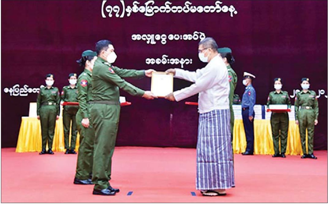 ဦးစွာ (၇၇) နှစ်မြောက် တပ်မတော်နေ့ကို ကြိုဆိုဂုဏ်ပြုသောအားဖြင့် ကုမ္ပဏီ ၁၇၆ ခု နှင့် စေတနာရှင်အလှူရှင်များက ဂုဏ်ပြုအလှူငွေ စုစုပေါင်းငွေကျပ် ၇၅၈၀၈၀၀၀၀ ကို ပေးအပ်လှူဒါန်းကြရာ စစ်ရေးချုပ် ဒုတိယ ဗိုလ်ချုပ်ကြီး မျိုးဇော်သိန်း၊ နေပြည်တော်တိုင်း စစ်ဌာနချုပ်တိုင်းမှူး ဗိုလ်ချုပ် ဇော်ဟိန်း၊ တပ်မတော်နေ့ ကျင်းပရေးစစ်ရေးပြလုပ်ငန်းအဖွဲ့ဥက္ကဋ္ဌ ဒုတိယ တပ်မတော် လေ့ကျင့်ရေး အရာရှိချုပ် ဗိုလ်ချုပ် ကိုလေး၊ တပ်မတော်နေ့ စစ်ရေးပြမှူးကြီး ဗိုလ်ချုပ် ရဲကျော်သူတို့က လက်ခံရယူပြီး ဂုဏ်ပြုမှတ်တမ်းလွှာများ ပြန်လည်ပေးအပ်ကြသည်။ ထို့နောက် အလှူရှင်များကိုယ်စား အလှူရှင်တစ်ဦးက လှူဒါန်းရခြင်းနှင့် ပတ်သက်၍ ရှင်းလင်းပြောကြားပြီး စစ်ရေးချုပ် ဒုတိယဗိုလ်ချုပ်ကြီး မျိုးဇော်သိန်း က ကျေးဇူးတင်စကား ပြန်လည်ပြောကြားသည်။