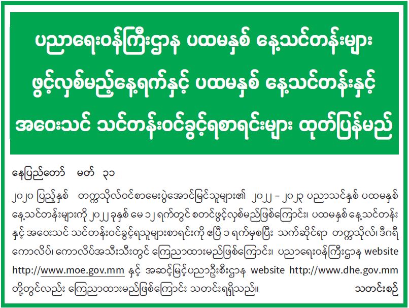 ပညာရေးဝန်ကြီးဌာန ပထမနှစ် နေ့သင်တန်းများ ဖွင့်လှစ်မည့်နေ့ရက်နှင့် ပထမနှစ် နေ့သင်တန်းနှင့် အဝေးသင် သင်တန်းဝင်ခွင့်ရစာရင်းများ ထုတ်ပြန်မည် 04/01/2022