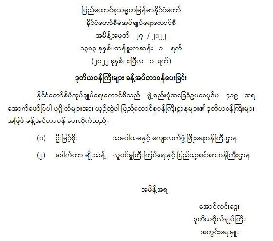 ဒုတိယဝန်ကြီးများ ခန့်အပ်တာဝန်ပေးခြင်း