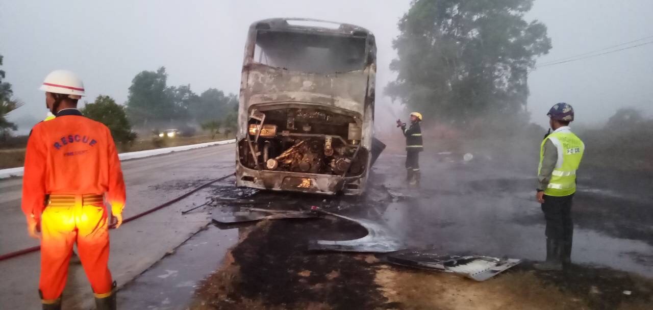 အဆိုပါဖြစ်စဉ်ကြောင့် Express ယာဉ်တစ်စီးလုံး မီးလောင်ကျွမ်းသွားခဲ့ပြီး ယာဉ်ပေါ်ပါ ယာဉ်မောင်း/ ယာဉ်နောက်လိုက် အပါအဝင် ခရီးသည်ကျား(၁၂) ဦးမ(၂၀) ဦးပေါင်း (၃၂) ဦးတို့တွင် ထိခိုက် ဒဏ်ရာ ရရှိမှုမရှိခဲ့ကြောင်းနှင့် မီးငြိမ်းသတ်နိုင်ရေးအတွက်အမြန်လမ်းမကြီးရဲတပ်ဖွဲ့ ဘောနတ်ကြီးစခန်းမှ တပ်ဖွဲ့ဝင် များနှင့် အထောက်အကူပြု အဖွဲ့ များ ကူညီဆောင်ရွက်လျက် ရှိကြောင်း သိရသည်။
