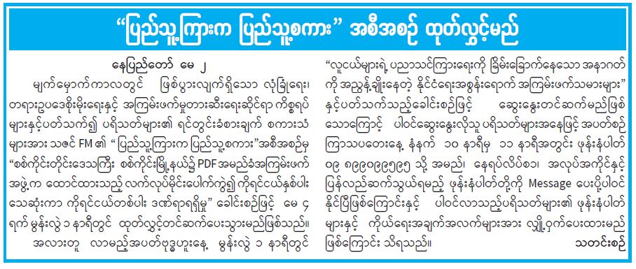 ပြည်သူ့ကြားက ပြည်သူ့စကား အစီအစဉ် ထုတ်လွှင့်မည်