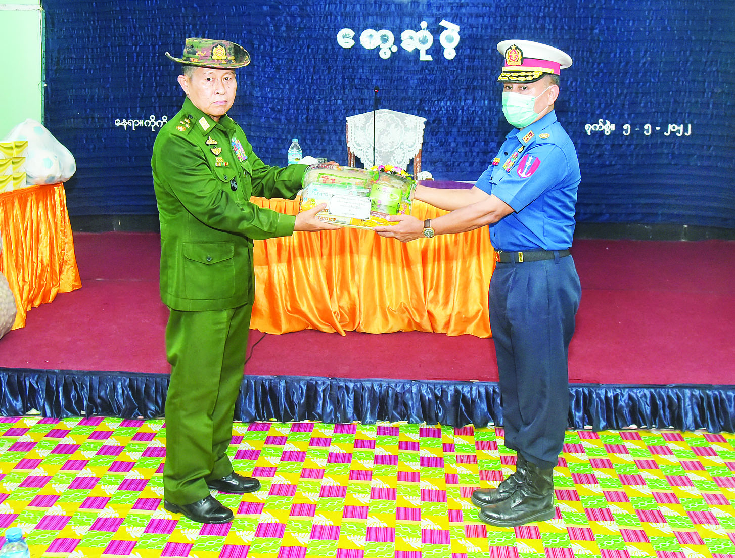 ထို့နောက် နိုင်ငံတော်စီမံအုပ်ချုပ်ရေးကောင်စီ ဒုတိယဥက္ကဋ္ဌ၊ ဒုတိယတပ်မတော် ကာကွယ်ရေးဦးစီးချုပ်၊ ကာကွယ်ရေးဦးစီးချုပ် (ကြည်း)သည် အရာရှိ၊ စစ်သည်၊ မိသားစုများအတွက် စားသောက်ဖွယ်ရာ ပစ္စည်းများပေးအပ်ရာ တာဝန်ရှိသူတို့က လက်ခံရယူကြသည်။