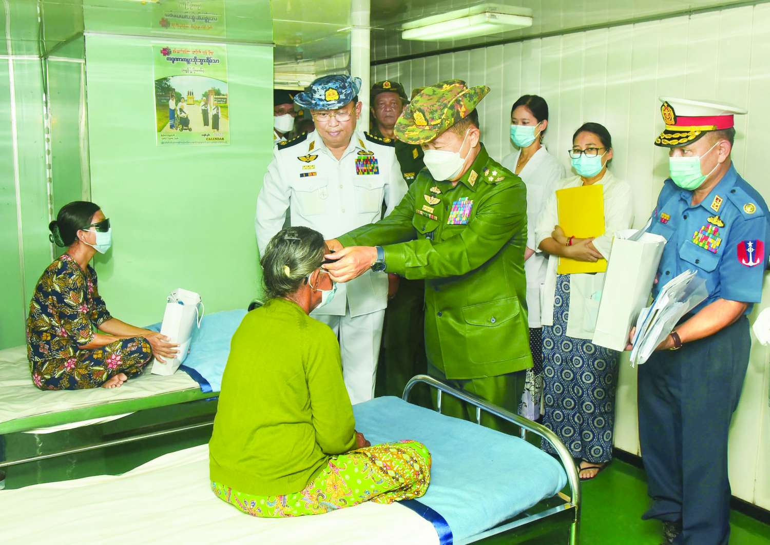 ထို့ပြင် ယနေ့နံနက်ပိုင်းတွင်လည်း နိုင်ငံတော်စီမံ အုပ်ချုပ်ရေးကောင်စီ ဒုတိယဥက္ကဋ္ဌ၊ ဒုတိယတပ်မတော်ကာကွယ်ရေးဦးစီးချုပ်၊ ကာကွယ်ရေးဦးစီးချုပ် (ကြည်း)သည် နိုင်ငံတော်စီမံအုပ်ချုပ်ရေး ကောင်စီအဖွဲ့ဝင်များ၊ ရန်ကုန်တိုင်းဒေသကြီး ဝန်ကြီးချုပ်နှင့် တာဝန်ရှိသူများ လိုက်ပါ၍ ပင်လယ်သွား ဆေးရုံ ရေယာဉ်(သံလွင်) သို့သွားရောက်၍ ဆေးရုံရေယာဉ်ပေါ်တွင် ဆေးကုသမှု ခံယူလျက်ရှိသည့် ကိုကိုးကျွန်းမြို့ရှိ ဒေသခံပြည်သူများ အားကြည့်ရှုအားပေး စကားပြောကြားကာ မျက်စိခွဲစိတ်လူနာများအား ဆေးမျက်မှန်များ တပ်ဆင်ပေးပြီး စားသောက်ဖွယ်ရာများ ထောက်ပံ့ပေးအပ်သည်။