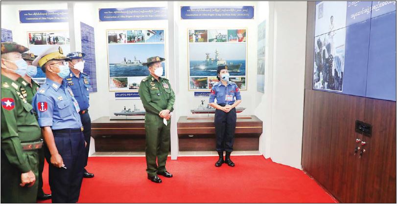 ဦးစွာ နိုင်ငံတော်စီမံအုပ်ချုပ်ရေးကောင်စီ ဒုတိယဥက္ကဋ္ဌ ဒုတိယတပ်မတော် ကာကွယ်ရေး ဦးစီးချုပ် ကာကွယ်ရေးဦးစီးချုပ်(ကြည်း)နှင့် အဖွဲ့ဝင်များသည် သန်လျင်ရေတပ် သင်္ဘောကျင်း ဌာနချုပ်ရှိ Motivation Hall သို့ရောက်ရှိကြပြီး တပ်မတော် (ရေ) တွင် အသုံးပြုလျက်ရှိသည့် စစ်ရေယာဉ်များ၏ မှတ်တမ်းဓာတ်ပုံများအား ကြည့်ရှုကြရာ တာဝန်ရှိသူများက လိုက်လံရှင်းလင်း ပြသကြသည်။