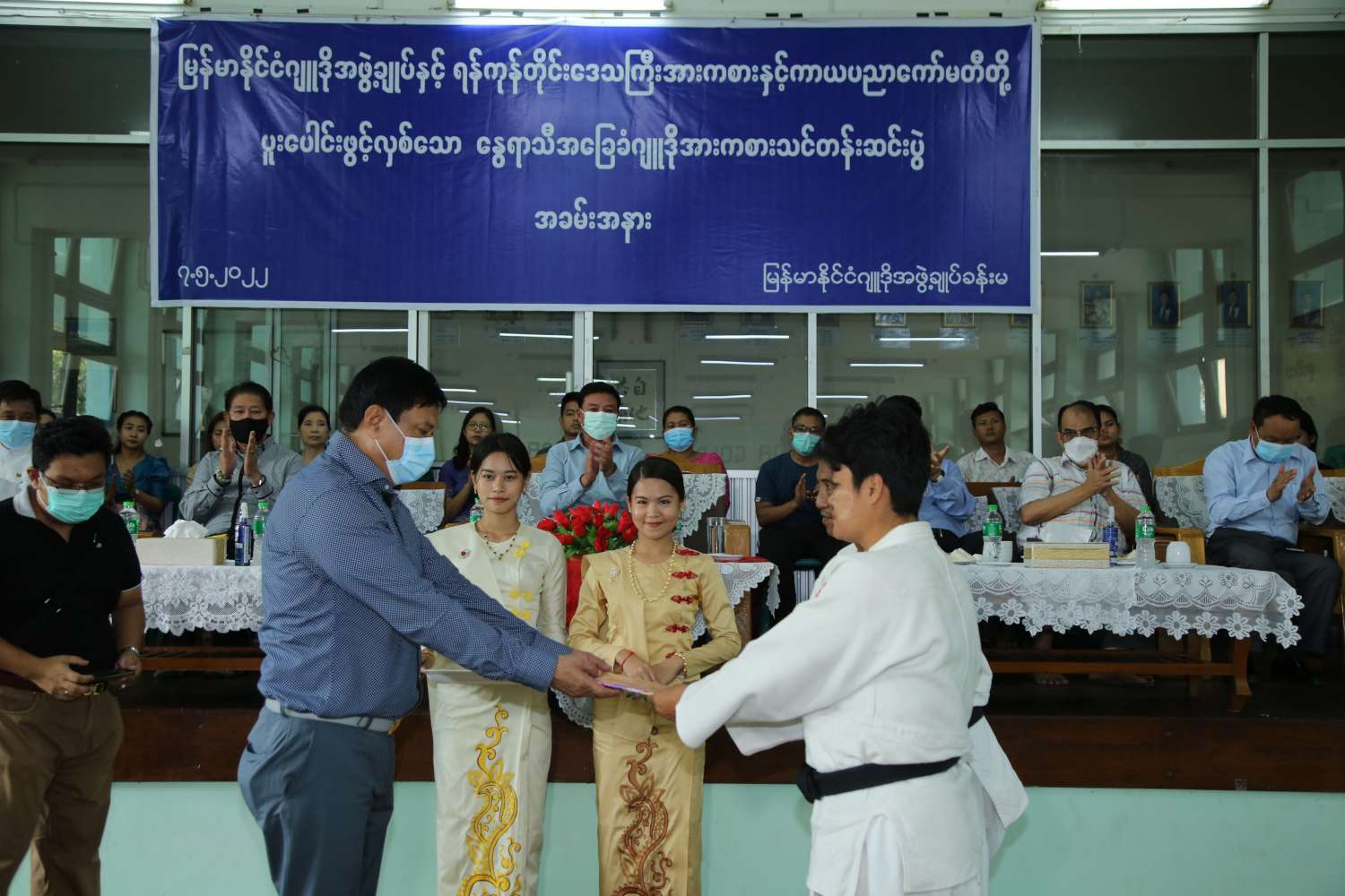 ဆက်လက်၍ မြန်မာနိုင်ငံ ဂျူဒိုအဖွဲ့ချုပ်ဥက္ကဋ္ဌ ဦးထွန်းထွန်းက သင်တန်းသား သင်တန်းသူများ ကျွမ်းကျင်မှုအဆင့်အလိုက် ခါးစည်းအဆင့်များ ပေးအပ်သည်။
