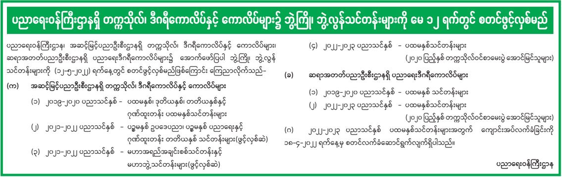 ပညာရေးဝန်ကြီးဌာနရှိ တက္ကသိုလ်၊ ဒီဂရီကောလိပ်နှင့် ကောလိပ်များ၌ ဘွဲ့ကြို၊ ဘွဲ့လွန်သင်တန်းများ ကို မေ ၁၂ ရက်တွင် စတင်ဖွင့်လှစ်မည်