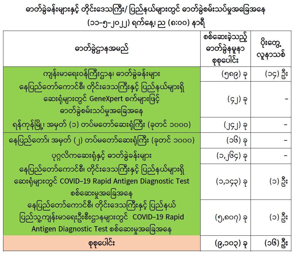 သို့ဖြစ်ပါ၍ ယနေ့အထိ ဓာတ်ခွဲနမူနာစုစုပေါင်း (၈,၀၄၉,၈၅၅) ခုအား စစ်ဆေးခဲ့ပြီး COVID-19 ဓာတ်ခွဲအတည်ပြုလူနာ စုစုပေါင်း (၆၁၃,၀၈၂) ဦး ရှိပြီ ဖြစ်ပါသည်။