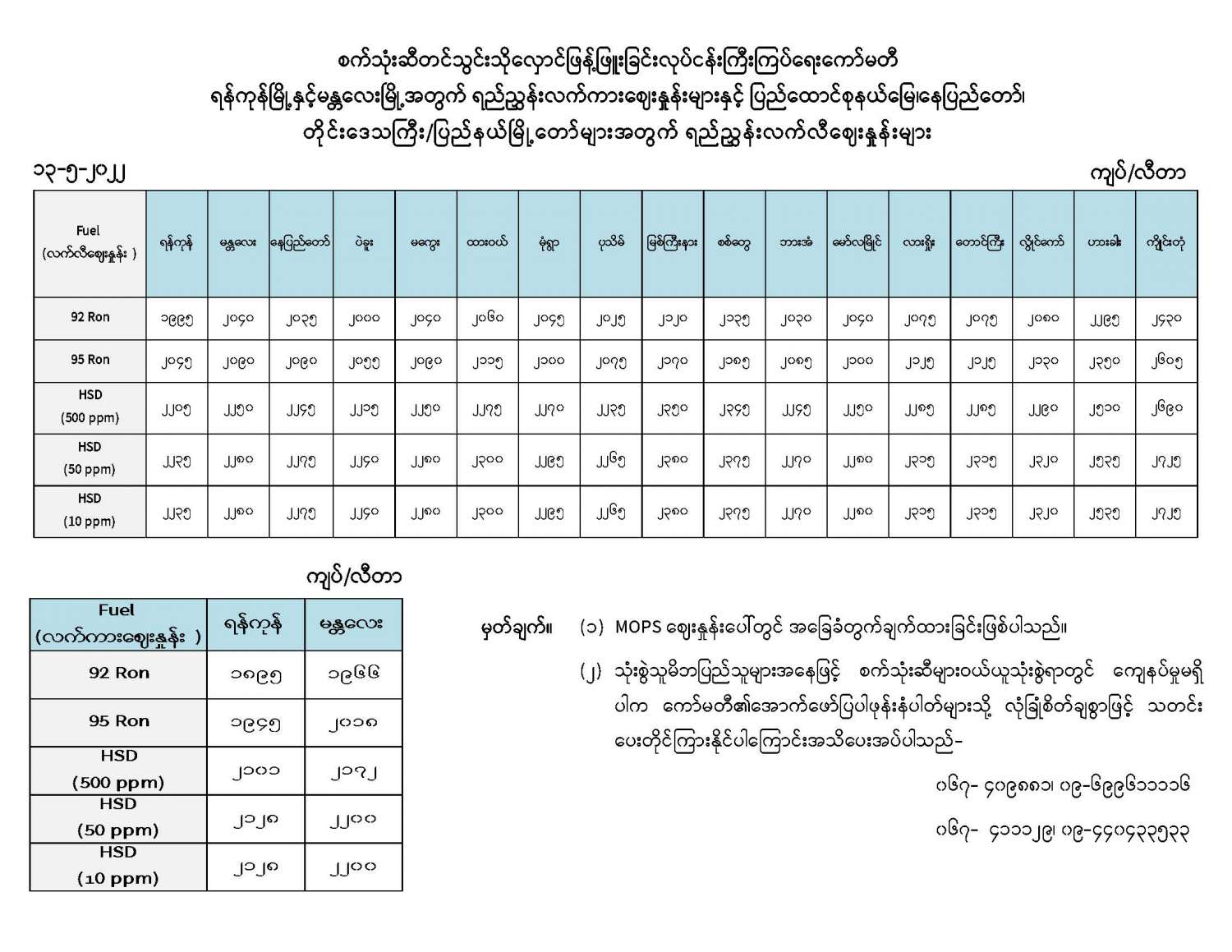 စက်သုံးဆီတင်သွင်းသိုလှောင်ဖြန့်ဖြူးခြင်းလုပ်ငန်းကြီးကြပ်ရေးကော်မတီ ရန်ကုန်မြို့နှင့် မန္တလေးမြို့အတွက် ရည်ညွှန်းလက်ကားဈေးနှုန်းများနှင့် ပြည်ထောင်စုနယ်မြေ၊ နေပြည်တော်၊ တိုင်းဒေသကြီး/ပြည်နယ်မြို့တော်များအတွက် ရည်ညွှန်းလက်လီဈေးနှုန်းများ