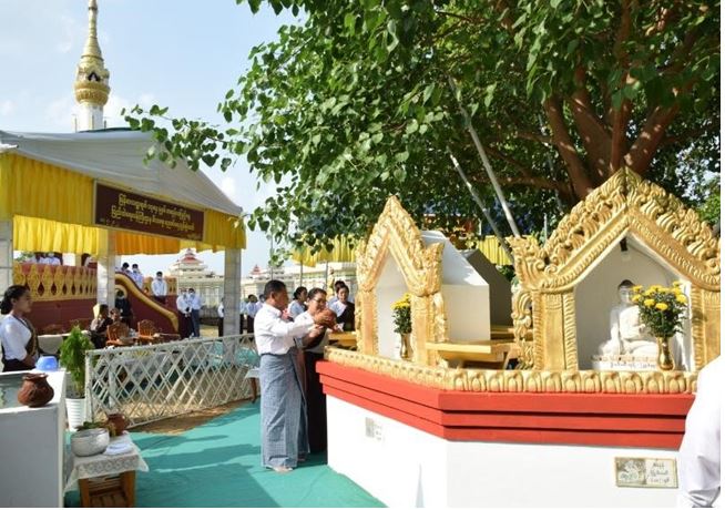 ထို့နောက် “မဟာဗောဓိ ရုက္ခသိဉ္ဇနပူဇာ” ဂါထာတော်အား ရွတ်ဖတ်ပူဇော်ကာ အခမ်းအနားဖွင့်လှစ်ပြီး ပြည်ထောင်စုဝန်ကြီးနှင့် ဇနီး၊ ဒုတိယဝန်ကြီးများနှင့် ဇနီးများ၊ ပြည်ထဲရေးဝန်ကြီးဌာနအောက်ရှိ တပ်ဖွဲ့၊ ဦးစီးဌာနများမှ အရာရှိကြီးများနှင့် ဇနီးများ၊ မိသားစုများသည် တောင်းဆုရ “ဝ”စေတီတော် ပရဝုဏ်အတွင်းရှိ “မဟာဗောဓိ” ညောင်ပင်အနီးတွင် ညောင်ရေသွန်းလောင်းပူဇော်ရန် နေရာယူကြကာ သတ်မှတ်ထားသည့်နေရာများမှ အဖွဲ့လိုက် “မဟာဗောဓိ” ညောင်ပင်ကို ညောင်ရေသွန်းလောင်းပူဇော်၍ အမွှေးနံ့သာရေများ ပက်ဖျန်းပူဇော်ပြီး ညောင်ရေသွန်းလောင်းပွဲအခမ်းအနားအား ရုပ်သိမ်းခဲ့ကြောင်း သိရသည်။