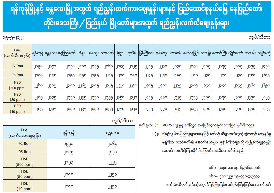 ရန်ကုန်မြို့နှင့် မန္တလေးမြို့အတွက် ရည်ညွှန်းလက်ကားဈေးနှုန်းများနှင့် ပြည်ထောင်စုနယ်မြေ နေပြည်တော်၊ တိုင်းဒေသကြီး/ပြည်နယ် မြို့တော်များအတွက် ရည်ညွှန်းလက်လီဈေးနှုန်းများ 05/15/2022