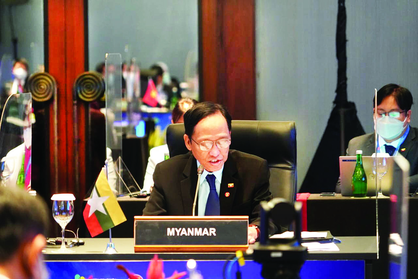 ဆက်လက်၍ ဒုတိယနေ့နံနက်ပိုင်း ဒုတိယပိုင်းအစီအစဉ်အဖြစ် (၉)ကြိမ်မြောက် အာဆီယံ+ ၃ ကျန်းမာရေးဝန်ကြီးများ အစည်းအဝေးကို “ပြည်သူ့ကျန်းမာရေးအရေးပေါ်အခြေအနေများတွင် ကျန်းမာရေးအရင်းအမြစ်များ ကောင်းမွန်စွာအသုံးချနိုင်ရေး” “Optimizing theMobilization of Essential Health Resources in responding to Public Health Crisis” ခေါင်းစဉ်ဖြင့် ကျင်းပပြုလုပ်ခဲ့ရာ ပြည်ထောင်စုဝန်ကြီးဒေါက်တာသက်ခိုင်ဝင်းက ဆွေးနွေးပြောကြားရာတွင် ပြည်သူ့ကျန်းမာအရေးပေါ်အခြေအနေများသည် မကြာခဏဖြစ်ပွားလျက်ရှိရာ ကျန်းမာရေးစောင့်ရှောက်မှုအရင်းအမြစ်များဖြစ်သည့် ကျန်းမာရေးလူ့စွမ်းအားများ၊ ဆေးနှင့်ဆေးပစ္စည်း ကိရိယာများ၊ ကျန်းမာရေးဘတ်ဂျက်များ လုံလောက်မှုမရှိခြင်း အစရှိသည့် အခက်အခဲများစွာ ကြုံတွေ့ရပါကြောင်း၊ အဆိုပါအခြေအနေများတွင် အကန့်အသတ်ရှိသည့် ကျန်းမာရေးအရင်း အမြစ်များအား အကျိုးရှိစွာအသုံးချနိုင်ရန် လိုအပ်ပါကြောင်း၊ မြန်မာနိုင်ငံအနေဖြင့် ဒေသတွင်းနိုင်ငံများနှင့်သာမက ကမ္ဘာ့နိုင်ငံများနှင့်ပါ ပူးပေါင်းဆောင်ရွက်လျက်ရှိပါကြောင်း၊ ကျန်းမာရေးနှင့်ဆက်စပ်ကဏ္ဍအသီးသီး၏ စုပေါင်းအင်အားဖြင့် ကိုဗစ်-၁၉ ကပ်ရောဂါတိုက်ဖျက်နိုင်ရေးလုပ်ငန်းများ ကြိုးစားဆောင်ရွက်ခဲ့ပါကြောင်း၊ ကမ္ဘာ့ကပ်ရောဂါများတုံ့ပြန် ဆောင်ရွက်ရာတွင် ကူးစက်ရောဂါများနှင့် ပတ်သက်သည့်သတင်း အချက်အလက်များ အာဆီယံအဖွဲ့ဝင်နိုင်ငံများ အချင်းချင်းအချိန်နှင့်တစ်ပြေးညီဖြန့်ဝေပေးခြင်း၊ ကျန်းမာရေးအရင်းအမြစ်များ အကျိုးရှိထိရောက်စွာ အသုံးချနိုင်ခြင်းအစရှိသည်တို့မှာ အရေးကြီးပါကြောင်း၊ ပြည်သူများကျန်းမာရေးအဆင့်အတန်းမြှင့်တင်ရေးအတွက် အနာဂတ်စိန်ခေါ်မှုများနှင့်အခွင့်အ လမ်းများကို ထိရောက်စွာအသုံးပြု၍ ဒေသတွင်းနိုင်ငံများနှင့်သာမက ကမ္ဘာ့နိုင်ငံများနှင့်ပါ ချိတ်ဆက်ဆောင်ရွက်သွားမည်ဖြစ်ပါကြောင်း ဆွေးနွေးပြောကြား၍ (၉)ကြိမ်မြောက် အာဆီယံ+၃ ကျန်းမာရေးဝန်ကြီးများအစည်းအဝေး ပူးတွဲကြေညာစာတမ်းအား အတည်ပြုထုတ်ပြန်ခဲ့ကြသည်။