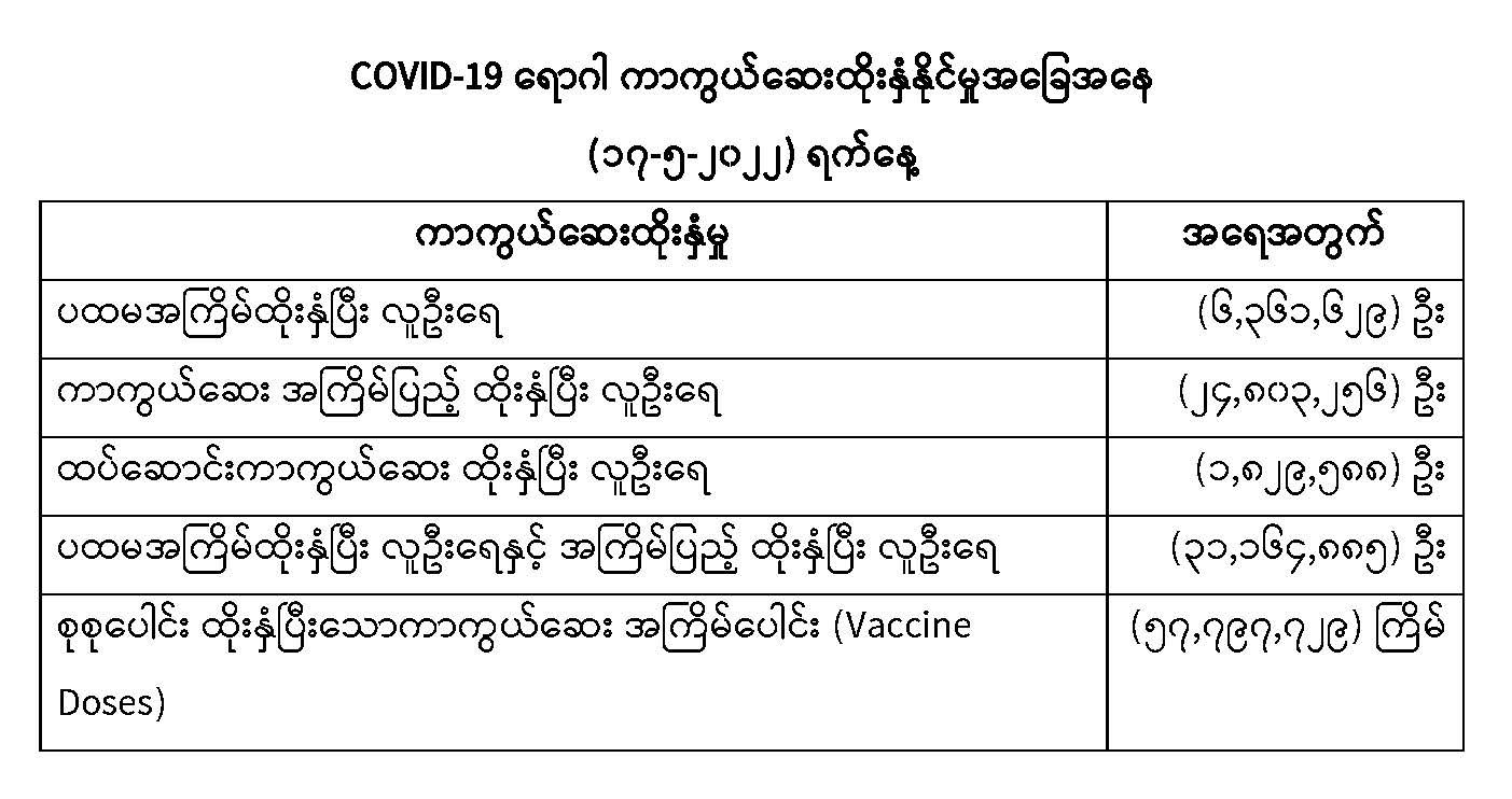 COVID-19 ရောဂါ ကာကွယ်ထိန်းချုပ်ရေးအတွက် တိုင်းဒေသကြီး/ပြည်နယ်များတွင် COVID-19 ရောဂါကာကွယ်ဆေးကို ဦးတည်အုပ်စုများသတ်မှတ်၍ ထိုးနှံပေးလျက်ရှိရာ (၁၇-၅-၂၀၂၂) ရက်နေ့ အထိ လူဦးရေ စုစုပေါင်း (31,၁6၄,၈၈၅) ဦးအား ထိုးနှံပေးပြီးဖြစ်၍ ပထမအကြိမ်ထိုးနှံပြီးစီးသူ (6,၃၆၁,၆၂၉) ဦး၊ ကာကွယ်ဆေးအကြိမ်ပြည့် ထိုးနှံပြီးစီးသူ (24,၈၀၃,၂၅၆) ဦးနှင့် ထပ်ဆောင်း ကာကွယ်ဆေး ထိုးနှံပြီးစီးသူ (1,၈၂၉,၅၈၈) ဦး ရှိပြီဖြစ်ပါသည်။ သို့ဖြစ်ပါ၍ (၁၇-၅-၂၀၂၂) ရက်နေ့ အထိ မြန်မာနိုင်ငံတွင် COVID-19 ရောဂါကာကွယ်ဆေး အကြိမ်ရေ စုစုပေါင်း (57,၇၉7,7၂၉) ကြိမ် ထိုးနှံပြီး ဖြစ်ပါသည်။