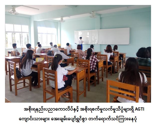 သိပ္ပံနှင့်နည်းပညာဝန်ကြီးဌာန၊ နည်းပညာ၊ သက်မွေးပညာနှင့် လေ့ကျင့်ရေးဦးစီးဌာနရှိ အစိုးရနည်းပညာကောလိပ်နှင့် အစိုးရစက်မှုလက်မှုသိပ္ပံများကို မေ ၁၂ ရက်မှ စတင်၍ ပုံမှန် ပြန်လည်ဖွင့်လှစ် သင်ကြားလျက်ရှိရာ AGTI ကျောင်းသားကျောင်းသူများ အေးချမ်းပျော်ရွင်စွာ ပညာသင်ကြားလျက်ရှိကြောင်း သိရသည်။