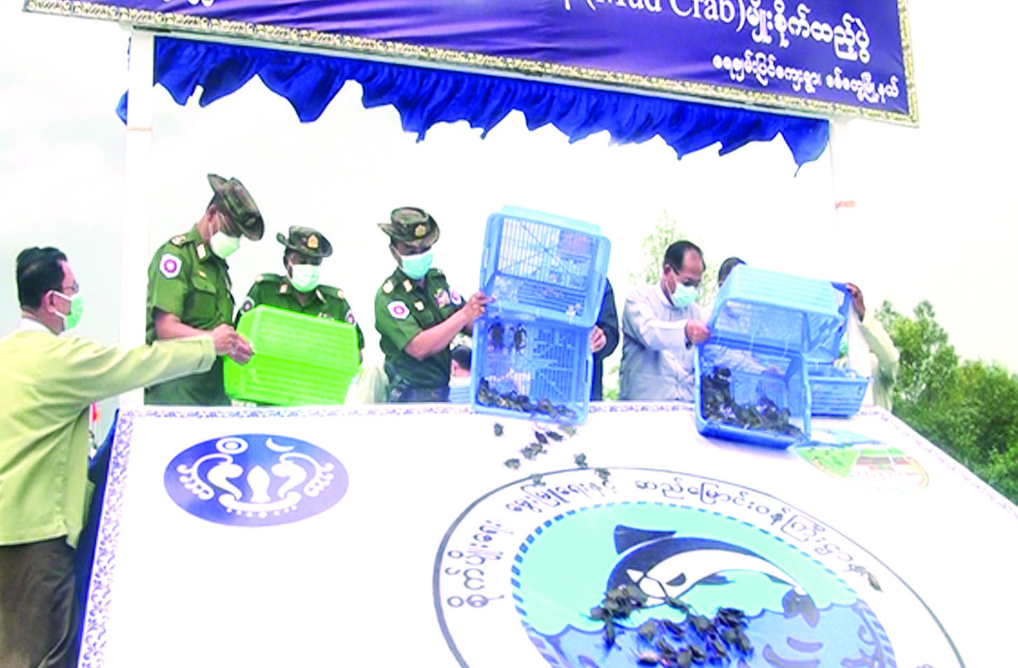 ရခိုင်ပြည်နယ် ငါးလုပ်ငန်းဦးစီးဌာန၏ ရွှံ့ကဏန်း မျိုးစိုက်ထည့်ခြင်းကို ယနေ့နံနက်ပိုင်းက စစ်တွေမြို့ ရေချမ်းပြင်ကျေးရွာ ကြွီတဲချောင်းကမ်းနံဘေး၌ ပြုလုပ်ရာ ရခိုင်ပြည်နယ် ဝန်ကြီးချုပ် ဒေါက်တာ အောင်ကျော်မင်း၊ အနောက်ပိုင်းတိုင်းစစ်ဌာနချုပ် တိုင်းမှူး ဗိုလ်ချုပ် ထင်လတ်ဦးနှင့် ဌာနဆိုင်ရာတာဝန် ရှိသူများ တက်ရောက်ကြသည်။