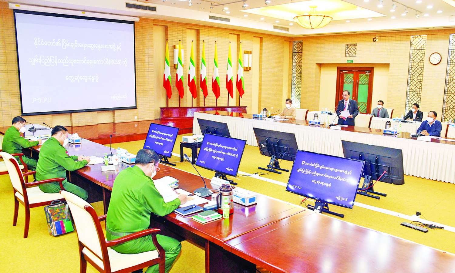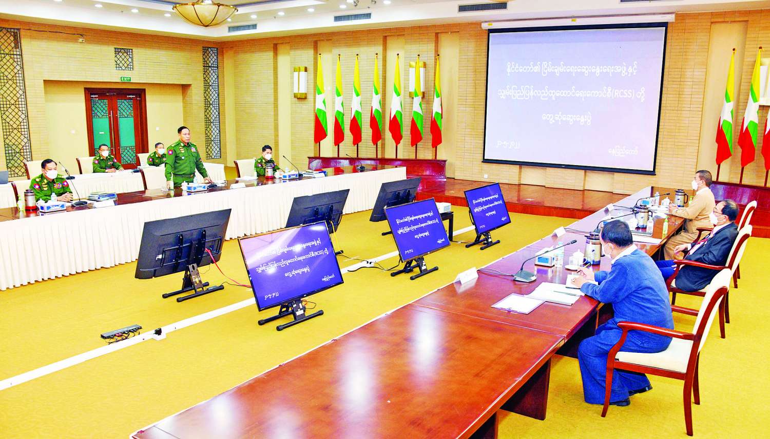 နိုင်ငံတော်၏ ငြိမ်းချမ်းရေးဆွေးနွေးရေးအဖွဲ့နှင့် သျှမ်းပြည်ပြန်လည်ထူထောင်ရေးကောင်စီ (RCSS)ဥက္ကဋ္ဌဦးဆောင်သော ကိုယ်စားလှယ်အဖွဲ့တို့တွေ့ဆုံဆွေးနွေးပွဲကို ယနေ့နံနက်ပိုင်းတွင် နေပြည်တော်ရှိ အမျိုးသားစည်းလုံးညီညွတ်ရေးနှင့် ငြိမ်းချမ်းရေးဖော်ဆောင်မှုဗဟိုဌာနအစည်းအဝေးခန်းမ၌ ကျင်းပသည်။