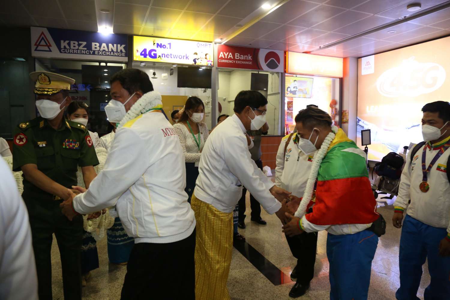 ဗီယက်နမ်နိုင်ငံ၊ ဟနွိုင်းမြို့နှင့် အခြားဆက်စပ်မြို့များတွင် မေ (၁၂)ရက်မှ (၂၃)ရက်အထိ ကျင်းပပြုလုပ်နေသည့် (၃၁)ကြိမ်မြောက် အရှေ့တောင်အာရှ အားကစားပြိုင်ပွဲတွင် ဝင်ရောက်ယှဉ်ပြိုင်ခဲ့သော မြန်မာအားကစားသမားအဖွဲ့သည် ယနေ့ညနေ ၄ နာရီတွင် ရန်ကုန်အပြည်ပြည်ဆိုင်ရာလေဆိပ်သို့ မြန်မာ့လေကြောင်း စင်းလုံးငှားလေယာဉ်ဖြင့် ပြန်လည်ရောက်ရှိလာရာ ရန်ကုန်တိုင်းဒေသကြီး အစိုးရအဖွဲ့ဝန်ကြီးချုပ် ဦးစိုးသိန်း၊ ရန်ကုန်တိုင်းဒေသကြီး စစ်ဌာနချုပ်တိုင်းမှူး ဗိုလ်ချုပ် ညွန့်ဝင်းဆွေ၊ ရန်ကုန်တိုင်းဒေသကြီး အစိုးရအဖွဲ့ဝင်ဝန်ကြီးများ၊ အားကစားနှင့်လူငယ်ရေးရာဝန်ကြီးဌာနမှ တာဝန်ရှိပုဂ္ဂိုလ်များ၊ မြန်မာနိုင်ငံ အားကစားအဖွဲ့ချုပ်များမှ ဥက္ကဋ္ဌများ၊ အနုပညာရှင်များ၊ ပြိုင်ပွဲဝင် အားကစားသမားများ၏ မိဘဆွေမျိုးများ၊ ဆရာ/ ဆရာမများနှင့် ကျောင်းသား/ ကျောင်းသူများ၊ မိဘပြည်သူများက အိုးစည်၊ ဒိုးပတ်များ၊ ပန်းစည်းများဖြင့် သောင်းသောင်းဖျဖျ ဂုဏ်ပြုကြိုဆိုကြသည်။