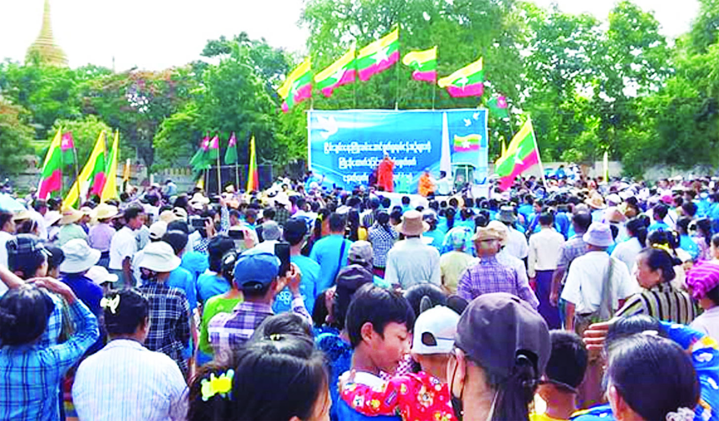 ယင်းနောက် သံဃာတော်များနှင့် စာရေးဆရာ ဆရာမများက ငြိမ်းချမ်းရေးကြိုးပမ်းမှု လုပ်ငန်းများကို ကြိုဆိုထောက်ခံခြင်းနှင့် ပြည်ပစွက်ဖက်နှောင့်ယှက်မှုများကို ဆန့်ကျင်ရှုတ်ချပွဲ ပြုလုပ်ရသည့် အကြောင်းနှင့် ငြိမ်းချမ်းရေးပန်းတိုင်ဆီ တို့သွားမည် ဟူသည့်ခေါင်းစဉ် တို့ဖြင့် ဆွေးနွေးဟောပြောကြသည်။ ယင်းနောက် ငြိမ်းချမ်းရေး လိုလားသူပြည်သူများက “ပြည်ထောင်စုမပြိုကွဲရေး-ဒို့အရေး၊ တိုင်းရင်းသားစည်းလုံးညီညွတ်ရေး-ဒို့အရေး၊ အချုပ်အခြာ အာဏာ တည်တံ့ခိုင်မြဲရေး-ဒို့အရေး၊ ပြည်ထောင်စုကြီးငြိမ်းချမ်းရေး-ဒို့အရေး၊ ပြည်ပစွက်ဖက်မှု အန္တရာယ် ဆန့်ကျင်တိုက်ဖျက်ရေး-ဒို့အရေး၊ ငြိမ်းချမ်းရေးပျက်ပြားအောင် ဆန့်ကျင်နေသူများ ကျဆုံးရေး-ဒို့အရေး၊ ငြိမ်းချမ်းရေးဆွေးနွေးပွဲကြီး အောင်ရမည်” စသည့်ကြွေးကြော်သံများဖြင့် ကြွေးကြော်၍ ထောက်ခံပွဲကို ရုပ်သိမ်းခဲ့ကြောင်း သတင်းရရှိသည်။