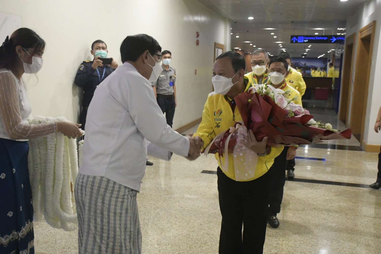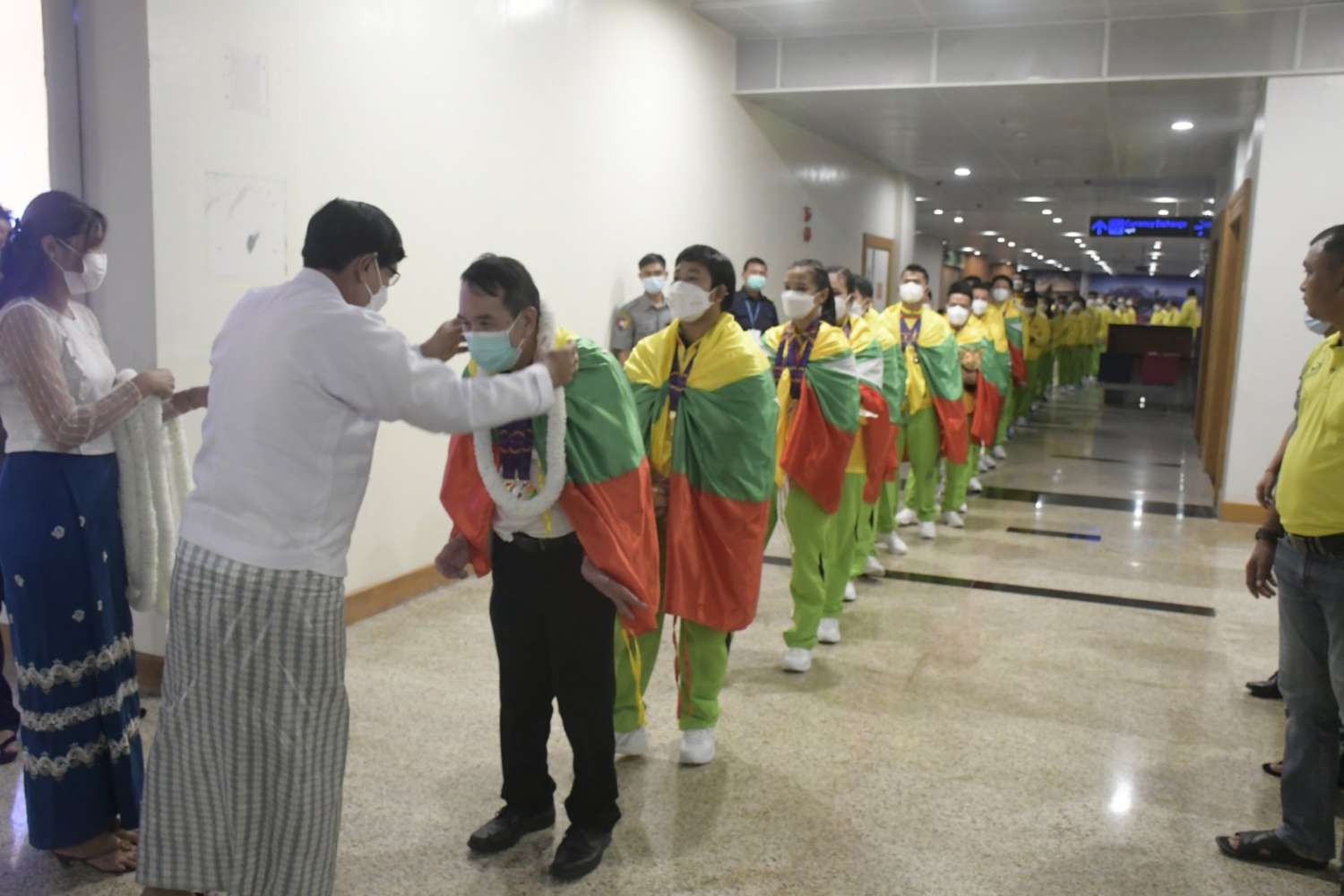 ပြန်လည်ရောက်ရှိလာသည့် မြန်မာအားကစားအဖွဲ့တွင် (၃၁)ကြိမ်မြောက် အရှေ့တောင် အာရှအားကစားပြိုင်ပွဲသို့ ဖိတ်ကြားခံပုဂ္ဂိုလ်အဖြစ် တက်ရောက်ခဲ့သည့် မြန်မာနိုင်ငံ အိုလံပစ်ကော်မတီ အထွေထွေအတွင်းရေးမှူး၊ အားကစားနှင့်လူငယ်ရေးရာဝန်ကြီးဌာန ဒုတိယဝန်ကြီး ဦးမျိုးလှိုင်၊ ရွှေတံဆိပ်ဆုရရှိခဲ့ကြသည့် Kurash အားကစားနည်း (+၈၇)ကီလိုမှ အေးအေးအောင်၊ ဘိလိယက် အားကစားနည်း အမျိုးသားတစ်ဦးချင်းပြိုင်ပွဲမှ ပေါက်စ၊ ဗိုဗီနမ် အားကစားနည်း အမျိုးသမီးနှစ်ယောက်တွဲ လက်နက်မဲ့အပြပြိုင်ပွဲမှ ခိုင်ဝါဖူး၊ မေဟန်နီအောင်လွင်၊ ပိုက်ကျော်ခြင်း အားကစားနည်း Double Women ပြိုင်ပွဲမှ ခင်နှင်းဝေ၊ ဖြူဖြူသန်း၊ ယမုံဇင်၊ ဗိုဗီနမ် အားကစားနည်း လေးယောက်တွဲ အပြပြိုင်ပွဲမှ မနားကွီး၊ အိုက်စိုးလင်း၊ ဇင်လင်းထွန်း၊ ဇော်ဇော်၊ ဗိုဗီနမ်အားကစားနည်း လေးယောက်တွဲအပြပြိုင်ပွဲမှရာဇာထွန်း၊ အောင်ခိုင်လင်း၊ ကျော်သူစိုးအောင်၊ ဟိန်းထက်အောင်၊ ငွေတံဆိပ်ဆုရရှိခဲ့ကြသည့် သေနတ်ပစ်အားကစားနည်း အမျိုသားမီတာ(၅၀) Pistol ပြိုင်ပွဲမှ ရဲထွန်းနောင်၊ မီတာ(၁၀) Air Pistol Mixed Team မှ ရဲထွန်းနောင်၊ ချစ်စိုးနွယ်၊ လှေလှော် အားကစားနည်း အမျိုးသား လေးယောက်လှော် မီတာ(၁၀၀၀) ပြိုင်ပွဲမှ မြင့်ကိုကို၊ ထက်ဝေလွင်၊ စောမိုးအောင်၊ ထွန်းမင်းသန့်၊ အောင်မျိုးသူ၊ ဂျူဒိုအားကစားနည် (-57) Kg မှ ခြူးမြတ်နိုးဝေ၊ ဗိုဗီနမ် အားကစားနည်း တစ်ကိုယ်တော် လက်သိုင်းအပြ ပြိုင်ပွဲမှ ခိုင်ဝါဖူး၊ တစ်ကိုယ်တော် ဓါးရှည်အပြ ပြိုင်ပွဲမှ မေဟန်နီအောင်လွင်၊ တုတ်ရှည်အပြပြိုင်ပွဲမှ တင်ထူးဇော်၊ ဘိလိယက်အားကစားနည်း အမျိုးသား နှစ်ယောက်တွဲပြိုင်ပွဲမှ ပေါက်စ၊ မင်းစည်သူထွန်း၊ လက်ဝှေ့ အားကစားနည်း (-57)Kg ပြိုင်ပွဲမှ နိုင်လတ်၊ ကြေးတံဆိပ်ဆုများရရှိခဲ့ကြသည့် လှေလှော် အားကစားနည်း အမျိုးသမီးကနူး တစ်ယောက်လှော် မီတာ(၁၀၀၀) ပြိုင်ပွဲ၊ အမျိုးသား ကနူး လေးယောက်လှော် မီတာ(၁၀၀၀)ပြိုင်ပွဲ၊ အမျိုးသား ကယက်နှစ်ယောက်လှော် မီတာ(၁၀၀၀) ပြိုင်ပွဲ၊ အမျိုးသားကနူး လေးယောက်လှော် မီတာ(၅၀၀) ပြိုင်ပွဲ၊ အမျိုးသမီးကနူးတစ်ယောက်လှော် မီတာ(၂၀၀)ပြိုင်ပွဲ၊ အမျိုးသမီး ကနူးလေးယောက်လှော် မီတာ(၂၀၀)ပြိုင်ပွဲတို့မှ သက်ဖြိုးနိုင်၊ ဝင်းထိုက်၊ စိုင်းမင်းဝေ၊ သန့်ဇင်ဦး၊ မင်းနိုင်၊ အောင်ဖြိုးဟိန်း၊ ထက်ဝေလွင်၊ မြင့်ကိုကို၊ အောင်မျိုးသူ၊ မျိုးလှိုင်ဝင်း၊ စုဝေဖြိုး၊ မြင့်မြင့်စိုး၊ မိုးမမ၊ စုစုလွင်၊ ပိုက်ကျော်ခြင်း အားကစားနည်း အမျိုးသား နှစ်ယောက်တွဲပြိုင်ပွဲ၊ အမျိုးသား လေးယောက်တွဲပြိုင်ပွဲ၊ အမျိုးသမီး လေးယောက်တွဲပြိုင်ပွဲတို့မှ ဝေလင်းအောင်၊ ကျော်ဇင်လတ်၊ အောင်မျိုးနိုင်၊ အောင်မျိုးဆွေ၊ ဇင်ကိုကို၊ အောင်ရဲဇော်၊ အောင်သူမင်း၊ ယမုံ