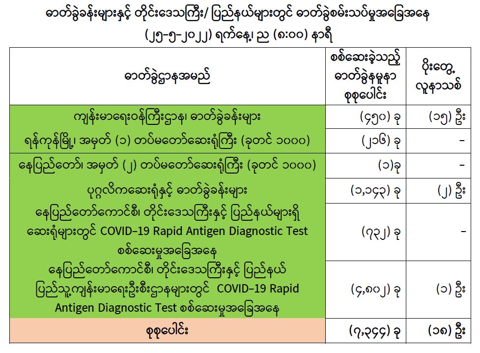 သို့ဖြစ်ပါ၍ ယနေ့အထိ ဓာတ်ခွဲနမူနာစုစုပေါင်း (၈,၁၆၁,၄၁၆) ခုအားစစ်ဆေးခဲ့ပြီး COVID-19 ဓာတ်ခွဲအတည်ပြုလူနာစုစုပေါင်း (၆၁၃,၂၅၆) ဦး ရှိပြီဖြစ်ပါသည်။