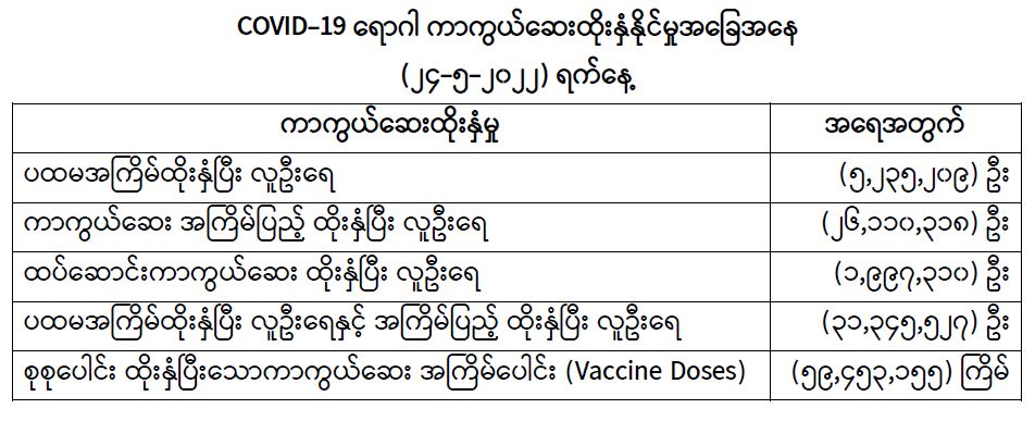 COVID-19 ရောဂါ ကာကွယ်ထိန်းချုပ်ရေးအတွက် တိုင်းဒေသကြီး/ပြည်နယ်များတွင် COVID-19 ရောဂါကာကွယ်ဆေးကို ဦးတည်အုပ်စုများ သတ်မှတ်၍ ထိုးနှံပေးလျက်ရှိရာ (၂၄-၅-၂၀၂၂) ရက်နေ့အထိ လူဦးရေစုစုပေါင်း (31,345,527) ဦးအား ထိုးနှံပေးပြီးဖြစ်၍ ပထမအကြိမ်ထိုးနှံပြီးစီးသူ (5,235,209) ဦး၊ ကာကွယ်ဆေးအကြိမ်ပြည့် ထိုးနှံပြီးစီးသူ (26,110,318) ဦးနှင့် ထပ်ဆောင်း ကာကွယ်ဆေးထိုးနှံပြီးစီးသူ (1,997,310) ဦးရှိပြီဖြစ်ပါသည်။ သို့ဖြစ်ပါ၍ (၂၄-၅-၂၀၂၂) ရက်နေ့အထိ မြန်မာနိုင်ငံတွင် COVID-19 ရောဂါကာကွယ်ဆေး အကြိမ်ရေစုစုပေါင်း (59,453,155) ကြိမ် ထိုးနှံပြီးဖြစ်ပါသည်။