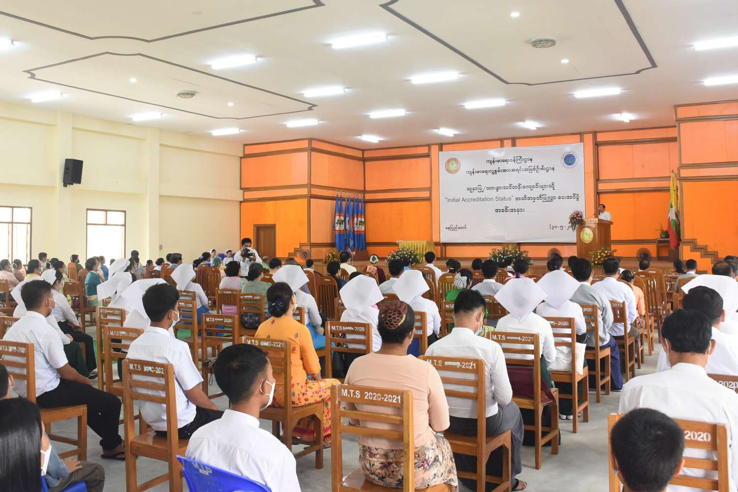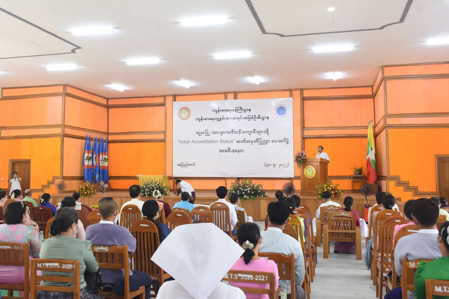 ဆက်လက်၍ ကျန်းမာရေးလူ့စွမ်းအားအရင်းအမြစ်ဦးစီးဌာန ညွှန်ကြားရေးမှူးချုပ် ဒေါက်တာတင်ထွန်းက ဂုဏ်ပြုအမှာစကားပြောကြားသည်။ ထို့နောက် မြန်မာနိုင်ငံသူနာပြုနှင့် သားဖွားကောင်စီဥက္ကဌမှ ကျန်းမာရေးလူ့စွမ်းအားအရင်းအမြစ်ဦးစီးဌာန၊ညွှန်ကြားရေးမှူးချုပ်ထံသို့ “Initial Accreditation Status” အသိအမှတ်ပြုလွှာများ ပေးအပ်ခဲ့ပြီးနောက် ကျန်းမာရေးလူ့စွမ်းအားအရင်းအမြစ်ဦးစီးဌာန၊ ညွှန်ကြားရေးမှူးချုပ်က သက်ဆိုင်ရာသင်တန်းကျောင်းအသီးသီးသို့ အသိအမှတ် ပြုလွှာများပြန်လည်ပေးအပ်သည်။ ထို့နောက် အသိအမှတ်ပြုလက်မှတ်ရ သင်တန်းကျောင်းများ ကိုယ်စား သူနာပြုသင်တန်းကျောင်း (ရန်ကုန်)၊ ကျောင်းအုပ်ကြီး (ဒုတိယညွှန်ကြားရေးမှူး)မှ ကျေးဇူးတင်စကား ပြောကြားခဲ့ကြောင်း သိရသည်။