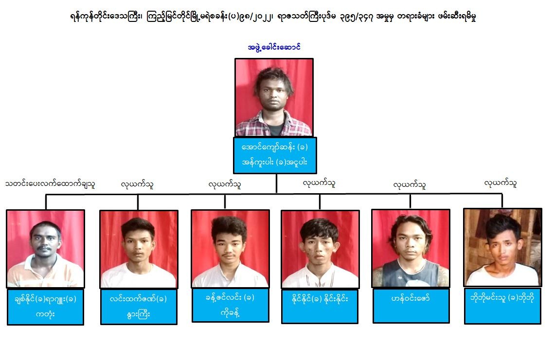 ထို့နောက် အမှုစစ်အဖွဲ့က ပြစ်မှုကျူးလွန်ရာတွင် ပါဝင်သည်ဟု သံသယရှိသူ ဓားပြတိုက်ခံရသည့် နေအိမ်၌ ဖွင့်လှစ်ထားသည့် “အောင် Car Aircon Service လုပ်ငန်း၌ အလုပ်လုပ်ကိုင်နေသည့် ဒလမြို့နယ်နေ ချစ်နိုင်(ခ) ရာဂျူး(ခ) ကတုံးအား ယင်းနေ့ညနေပိုင်း၌ ဖမ်းဆီးစစ်ဆေးခဲ့ရာ ၎င်း၏ ပူးပေါင်းပါဝင်မှုဖြင့် ဓားပြတိုက်မှုအား ဒလမြို့နယ်၊ ကမာကဆစ်ရပ်ကွက်၊ ကျန်စစ်သား (၄)လမ်း၊ အမှတ်(၂၉၉)နေ ၎င်း၏ဦးလေးတော်စပ်သူ အောင်ကျော်ဆန်း (ခ) အန်ကူးပါး (ခ) အငူပါးမှ ဦးဆောင်၍ ကျူးလွန်ခဲ့ခြင်းဖြစ်ကြောင်း ဖော်ထုတ်သိရှိရသဖြင့် ပြစ်မှုကျူးလွန်သူများအား ဖော်ထုတ်ဖမ်းဆီးရမိနိုင်ရေး ဆက်လက်ဆောင်ရွက်ခဲ့ရာ အောင်ကျော်ဆန်း (ခ) အန်ကူးပါး(ခ) အငူပါးအား မေလ ၃၁ ရက် ညနေ ၅ နာရီ ၁၅ မိနစ်အချိန်တွင် သာကေတမြို့နယ်၊ (၁၄)ရပ်ကွက်၊ သလ္လာဝတီ(၂)လမ်းရှိ ဓားပြတိုက်မှု ကျူးလွန်ရာတွင် ပါဝင်ခဲ့သူ လင်းထက်ဇဏ်(ခ) နွားကြီး (၁၉)နှစ်၏ နေအိမ်၌ လင်းထက်ဇဏ်(ခ) နွားကြီး၊ စက်မြေရပ်ကွက်နေ ခန့်ဇင်လင်း(ခ) ကိုခန့် (၁၈)နှစ်၊ မှော်စက်ရပ်ကွက်နေ နိုင်နိုင်(ခ) နိုင်းနိုင်း (၂၀) နှစ်တို့ ၃ ဦးနှင့်အတူ ဖမ်းဆီးရမိခဲ့သည်။