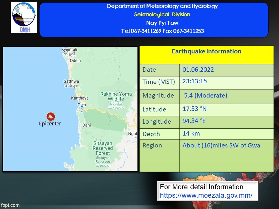 ၂၀၂၂ ခုနှစ်၊ ဇွန်လ (၁)ရက်နေ့၊ မြန်မာစံတော်ချိန် (၂၃)နာရီ၊ (၁၃)မိနစ်၊ (၁၅)စက္ကန့် အချိန်တွင် ဂွမြေငလျင်စခန်းမှ အနောက်တောင်ဘက် (၁၆)မိုင်ခန့်ကွာဝေးသော (မြန်မာ့ပင်လယ်ပြင်၊ ဂွမြို့၏ အနောက်တောင်ဘက် (၁၆)မိုင်ခန့်အကွာ) မြောက်လတ္တီတွဒ် (၁၇.၅၃) ဒီဂရီ၊ အရှေ့လောင်ဂျီတွဒ် (၉၄.၃၄)ဒီဂရီ၊ အနက် (၁၄)ကီလိုမီတာကို ဗဟိုပြု၍ အင်အား ရစ်(ခ်)တာစကေး (၅.၄)အဆင့်ရှိ အင်အားအသင့်အတင့်ရှိသော မြေငလျင်တစ်ခု လှုပ်ရှား သွားကြောင်း တိုင်းထွာရရှိပါသည်။
