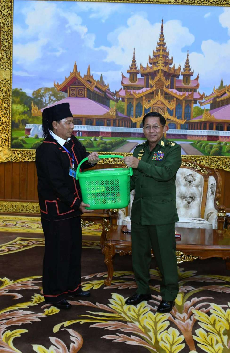 တွေ့ဆုံပွဲအပြီးတွင် နိုင်ငံတော်စီမံအုပ်ချုပ်ရေးကောင်စီဥက္ကဋ္ဌ တပ်မတော်ကာကွယ်ရေးဦးစီးချုပ်က လားဟူဒီမိုကရက်တစ်အစည်းအရုံး(LDU)မှ အထွေထွေအတွင်းရေးမှူးနှင့် အဖွဲ့ဝင်များအား အမှတ်တရလက်ဆောင်ပစ္စည်းများ ပေးအပ်ရာ လားဟူဒီမိုကရက်တစ်အစည်းအရုံး (LDU)မှ အထွေထွေအတွင်းရေးမှူးက ဒေသထွက်လက်ဆောင်ပစ္စည်းများကို ပြန်လည်ပေးအပ်ခဲ့ပြီး အမှတ်တရစုပေါင်းဓာတ်ပုံရိုက်ကြသည်။