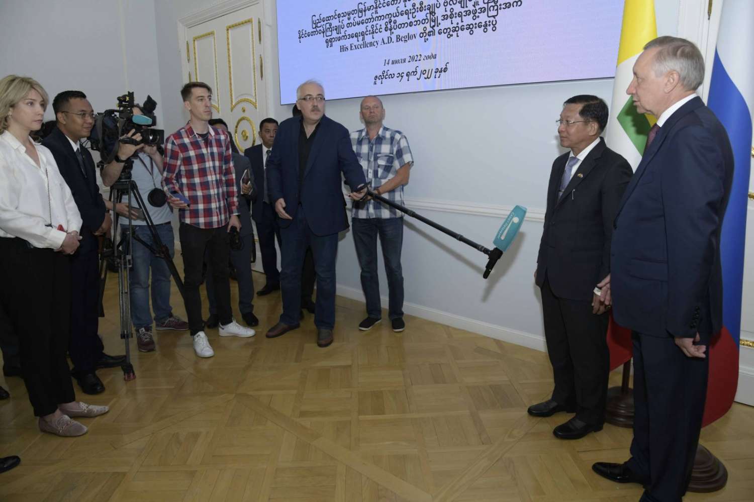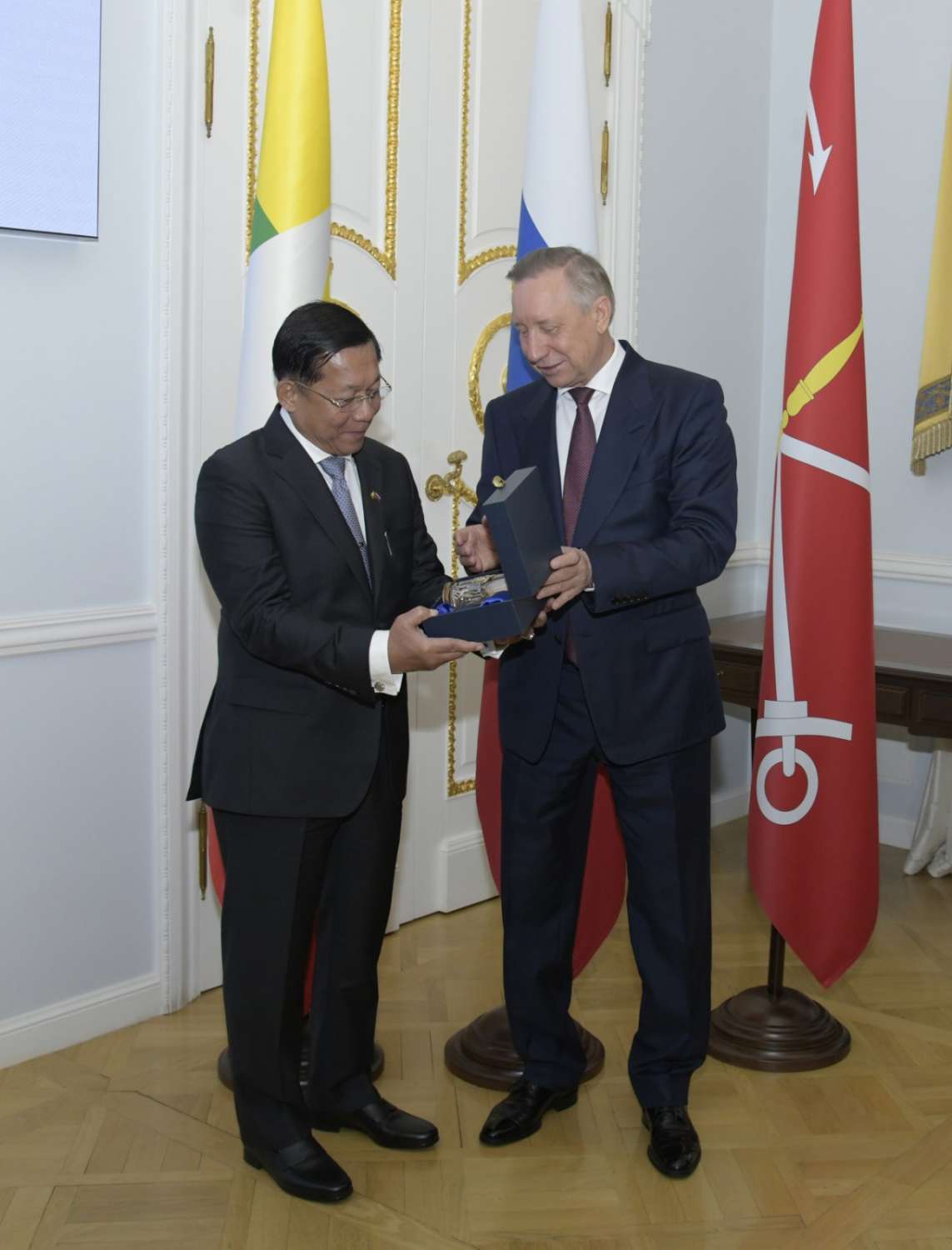 ရုရှားဖက်ဒရေးရှင်းနိုင်ငံသို့ ရောက်ရှိနေသည့် နိုင်ငံတော်စီမံအုပ်ချုပ်ရေး ကောင်စီဥက္ကဋ္ဌ၊ နိုင်ငံတော်ဝန်ကြီးချုပ် ဗိုလ်ချုပ်မှူးကြီး မင်းအောင်လှိုင်သည် ဇူလိုင် ၁၄ ရက် ဒေသစံတော်ချိန် နံနက်ပိုင်းတွင် စိန့်ပီတာစဘတ်မြို့အစိုးရအဖွဲ့ အကြီးအကဲ Mr.Alexander Beglov နှင့် အစိုးရအဖွဲ့ရုံး၌ တွေ့ဆုံဆွေးနွေးသည်။