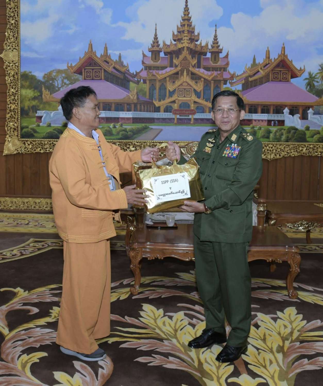 တွေ့ဆုံပွဲအပြီးတွင် နိုင်ငံတော်စီမံအုပ်ချုပ်ရေးကောင်စီဥက္ကဋ္ဌ တပ်မတော်ကာကွယ်ရေးဦးစီးချုပ်က ရှမ်းပြည်တိုးတက်ရေးပါတီ(SSPP)မှ ဒုတိယဥက္ကဋ္ဌ (၁)နှင့် အဖွဲ့ဝင်များအား အမှတ်တရလက်ဆောင်ပစ္စည်းများပေးအပ်ရာ ရှမ်းပြည်တိုးတက်ရေးပါတီ(SSPP)မှ ဒုတိယဥက္ကဋ္ဌ(၁)မှ ဒေသထွက်လက်ဆောင်ပစ္စည်းများကို ပြန်လည်ပေးအပ်ခဲ့ပြီး အမှတ်တရစုပေါင်းဓာတ်ပုံရိုက်ကြသည်။