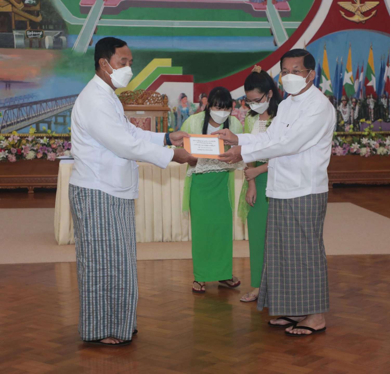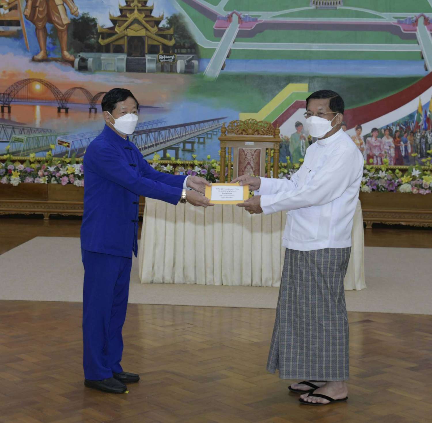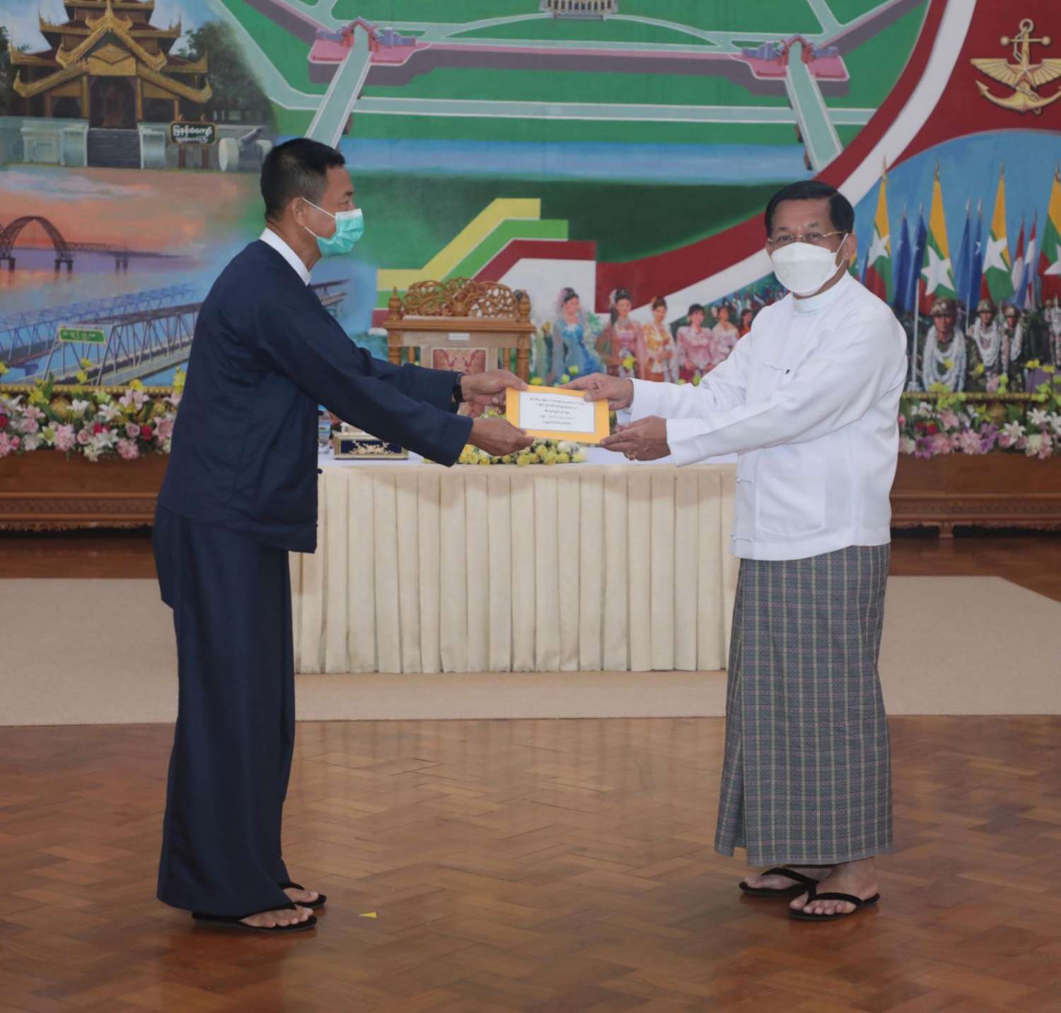 ထို့နောက် နိုင်ငံတော်စီမံအုပ်ချုပ်ရေးကောင်စီဥက္ကဋ္ဌ နိုင်ငံတော်ဝန်ကြီးချုပ်က နိုင်ငံ့စီးပွား မြှင့်တင်ရေး ရန်ပုံငွေမှ ထောက်ပံ့ငွေကို ပေးအပ်ရာ စိုက်ပျိုးရေး၊ မွေးမြူရေးနှင့် ဆည်မြောင်း ဝန်ကြီးဌာန ပြည်ထောင်စုဦးတင်ထွဋ်ဦး၊ သမဝါယမနှင့် ကျေးလက်ဖွံ့ဖြိုးရေးဝန်ကြီးဌာန ပြည်ထောင်စုဝန်ကြီး ဦးလှမိုး၊ ကချင်ပြည်နယ်၊ ကယား ပြည်နယ်၊ ကရင်ပြည်နယ်၊ ချင်းပြည်နယ်၊ တနင်္သာရီတိုင်းဒေသကြီး၊ မွန်ပြည်နယ်၊ ရခိုင်ပြည်နယ်၊ ရှမ်းပြည်နယ် အစိုးရအဖွဲ့တို့မှ ဝန်ကြီးချုပ်များ၊ နာဂ၊ ဓနု၊ ပအိုဝ့်၊ ပလောင်၊ ကိုးကန့် ကိုယ်ပိုင် အုပ်ချုပ်ခွင့်ရဒေသတို့နှင့် “ဝ” ကိုယ်ပိုင်အုပ်ချုပ်ခွင့်ရတိုင်း စီမံအုပ်ချုပ်ရေး အဖွဲ့တို့မှ ဥက္ကဋ္ဌများက အသီးသီး လက်ခံရယူကြသည်။
