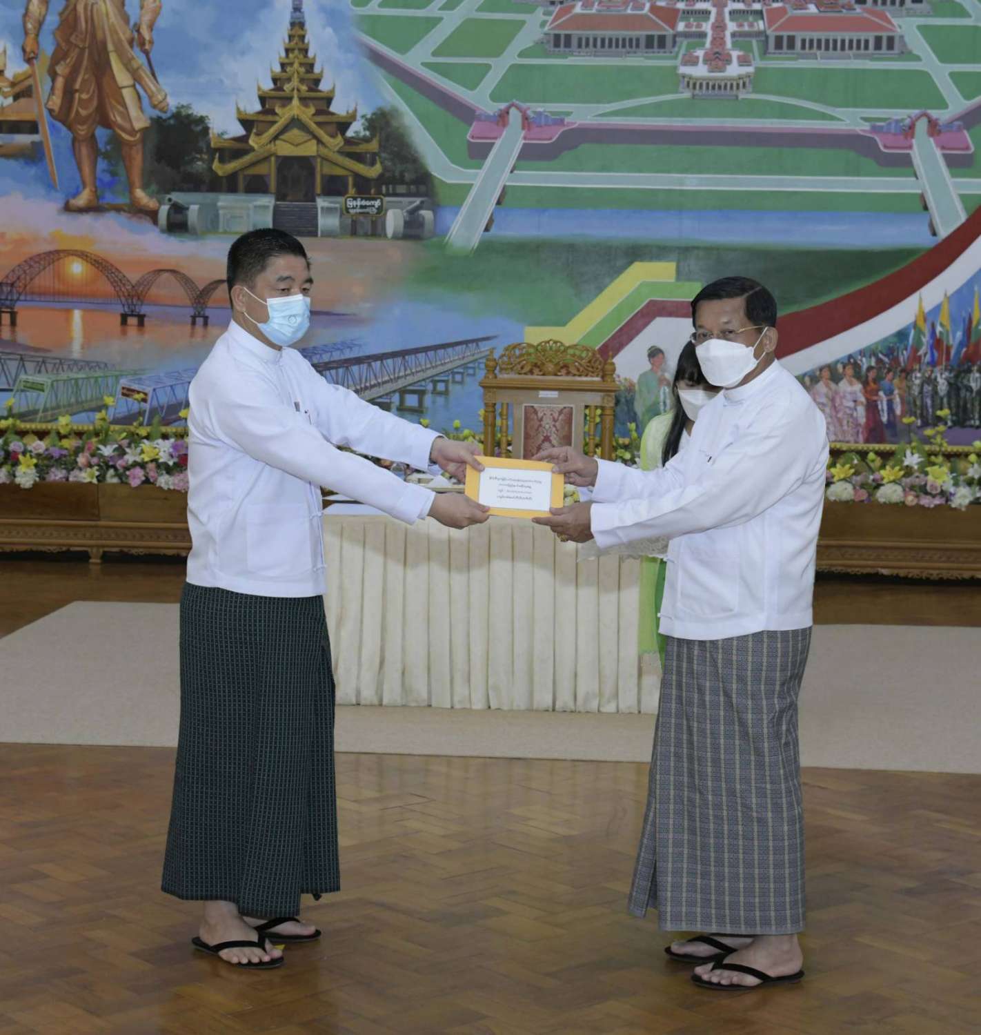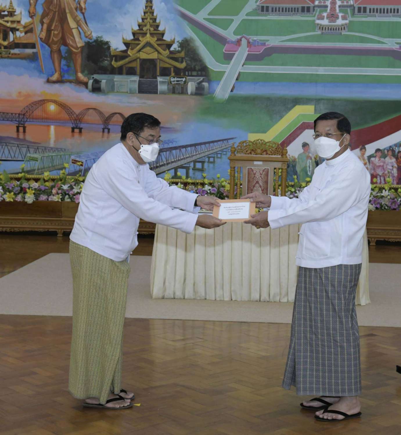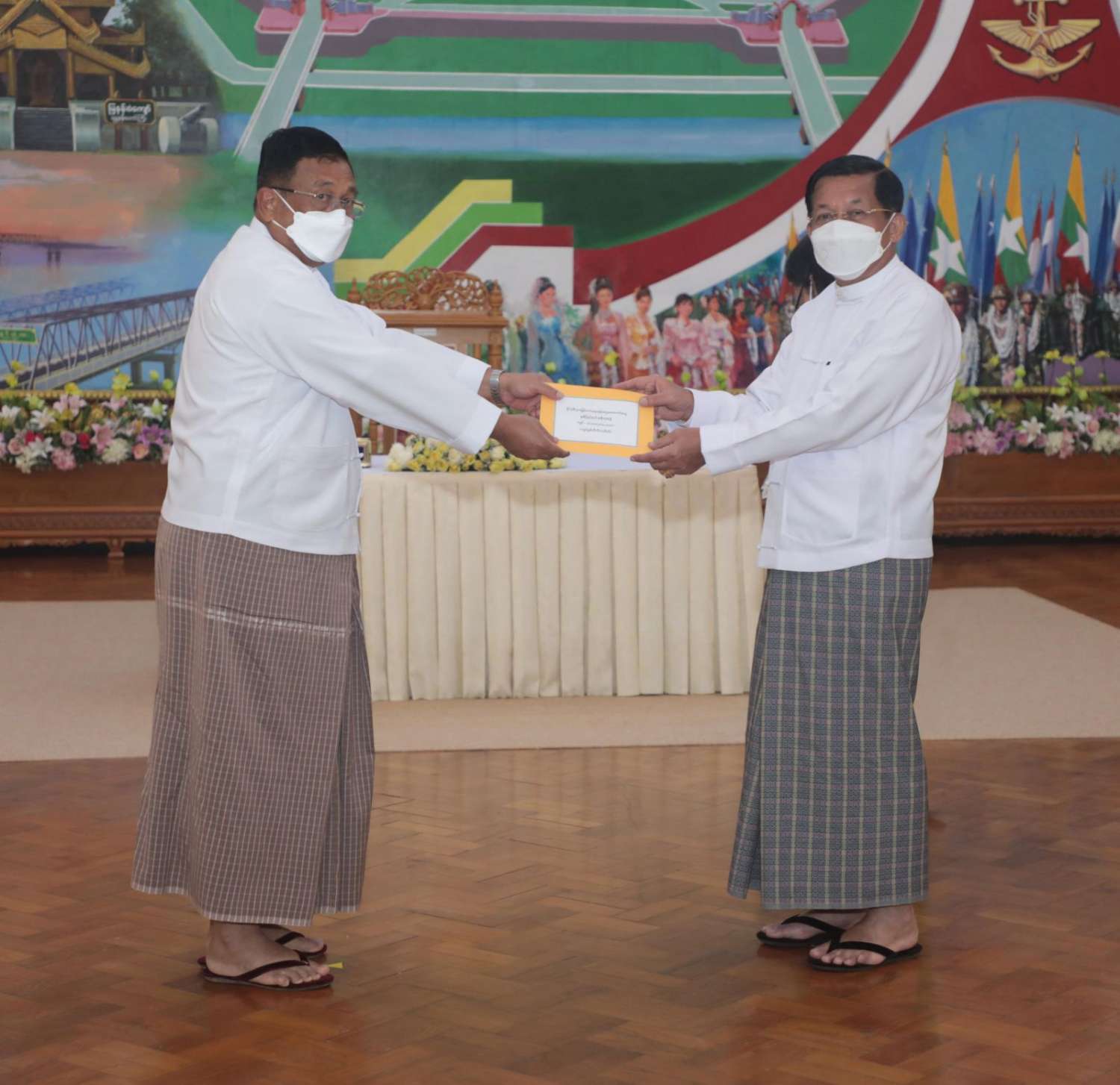 ထို့နောက် နိုင်ငံတော်စီမံအုပ်ချုပ်ရေးကောင်စီဥက္ကဋ္ဌ နိုင်ငံတော်ဝန်ကြီးချုပ်က နိုင်ငံ့စီးပွား မြှင့်တင်ရေး ရန်ပုံငွေမှ ထောက်ပံ့ငွေကို ပေးအပ်ရာ စိုက်ပျိုးရေး၊ မွေးမြူရေးနှင့် ဆည်မြောင်း ဝန်ကြီးဌာန ပြည်ထောင်စုဦးတင်ထွဋ်ဦး၊ သမဝါယမနှင့် ကျေးလက်ဖွံ့ဖြိုးရေးဝန်ကြီးဌာန ပြည်ထောင်စုဝန်ကြီး ဦးလှမိုး၊ ကချင်ပြည်နယ်၊ ကယား ပြည်နယ်၊ ကရင်ပြည်နယ်၊ ချင်းပြည်နယ်၊ တနင်္သာရီတိုင်းဒေသကြီး၊ မွန်ပြည်နယ်၊ ရခိုင်ပြည်နယ်၊ ရှမ်းပြည်နယ် အစိုးရအဖွဲ့တို့မှ ဝန်ကြီးချုပ်များ၊ နာဂ၊ ဓနု၊ ပအိုဝ့်၊ ပလောင်၊ ကိုးကန့် ကိုယ်ပိုင် အုပ်ချုပ်ခွင့်ရဒေသတို့နှင့် “ဝ” ကိုယ်ပိုင်အုပ်ချုပ်ခွင့်ရတိုင်း စီမံအုပ်ချုပ်ရေး အဖွဲ့တို့မှ ဥက္ကဋ္ဌများက အသီးသီး လက်ခံရယူကြသည်။