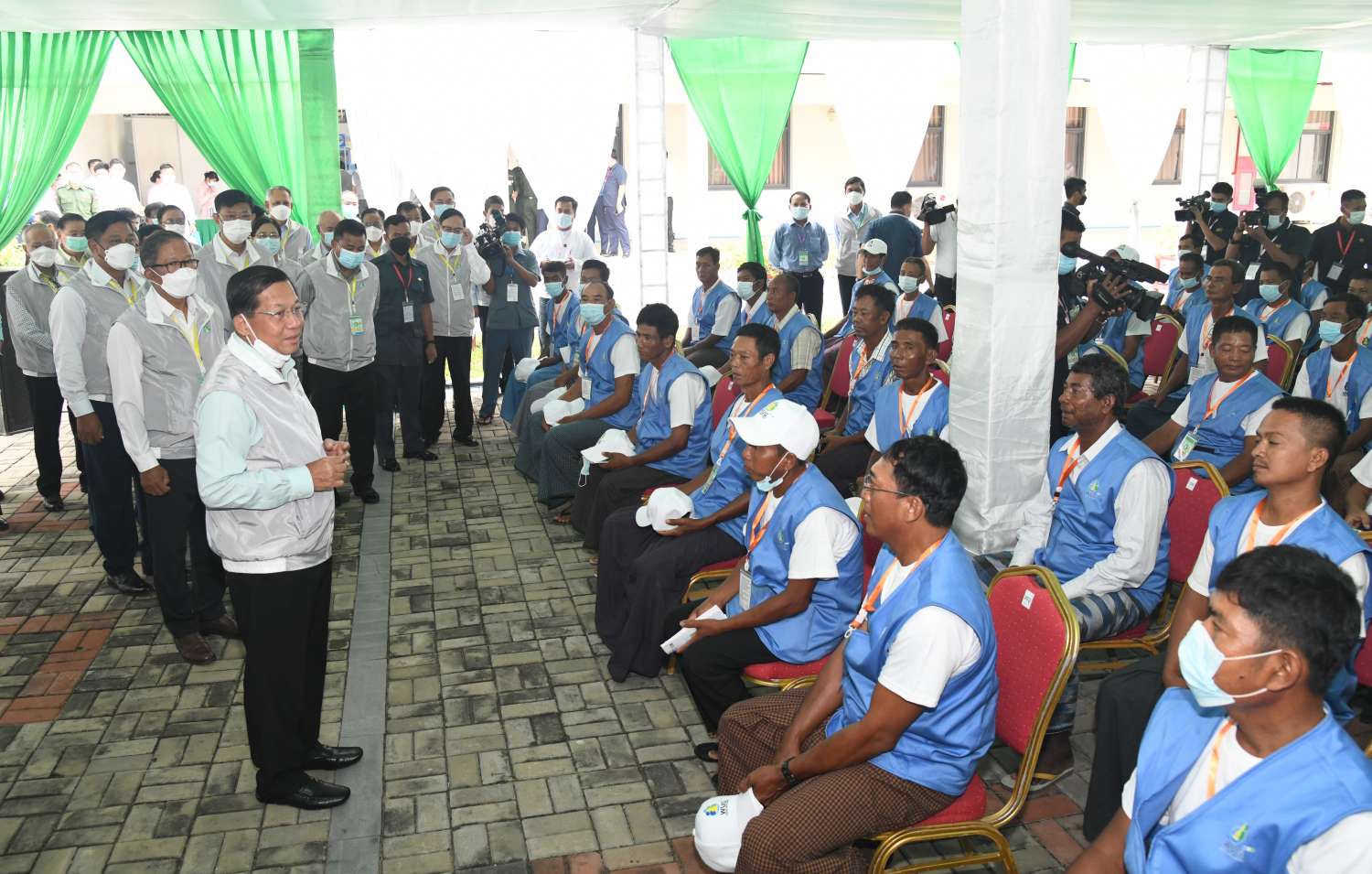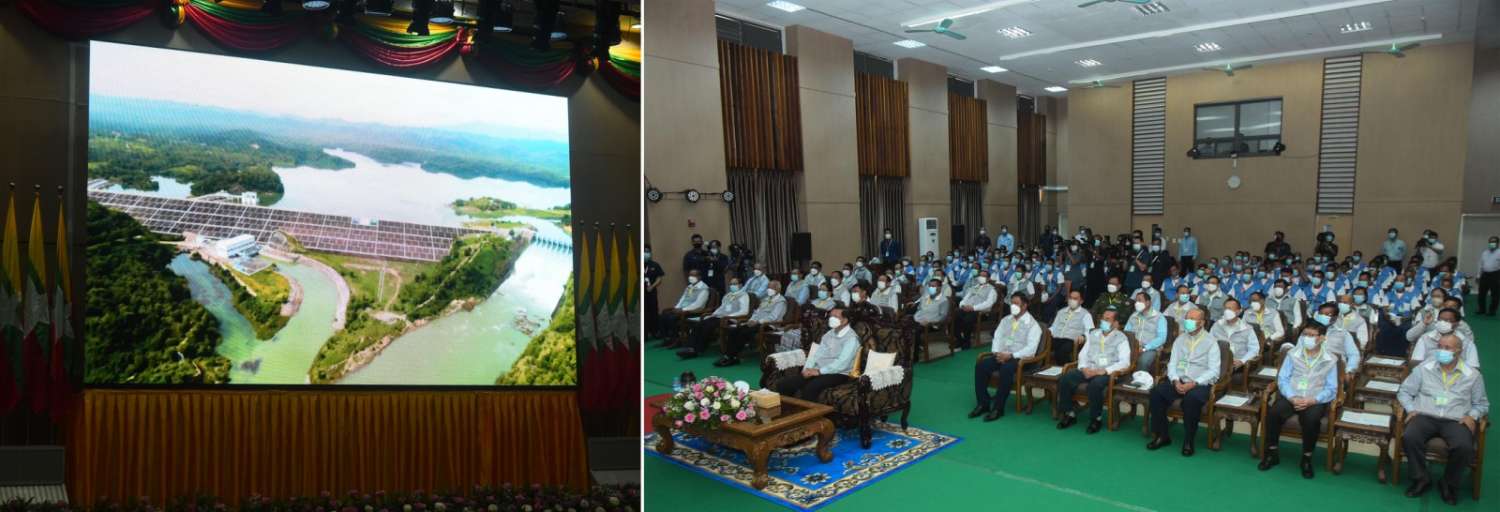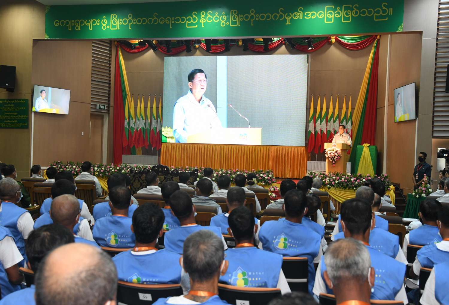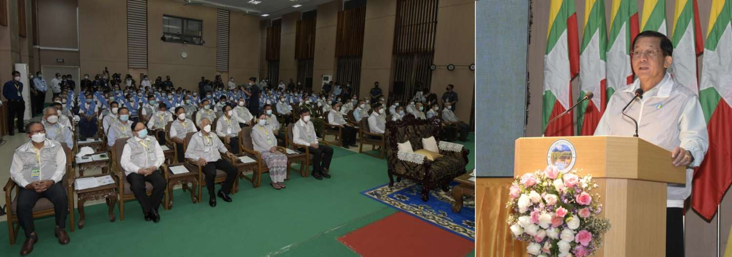 နိုင်ငံတော်စီမံအုပ်ချုပ်ရေးကောင်စီဥက္ကဋ္ဌ နိုင်ငံတော်ဝန်ကြီးချုပ် ဗိုလ်ချုပ်မှူးကြီး မင်းအောင်လှိုင် ပူးပေါင်းပါဝင် ဆည်မြောင်းစနစ်ဖြင့် လယ်ယာကဏ္ဍနှင့် တောင်သူတို့၏ လူမှုစီးပွားဘဝ မြှင့်တင်ရေး ဆွေးနွေးပွဲဖွင့်ပွဲ အခမ်းအနားသို့ တက်ရောက်အမှာစကားပြောကြား