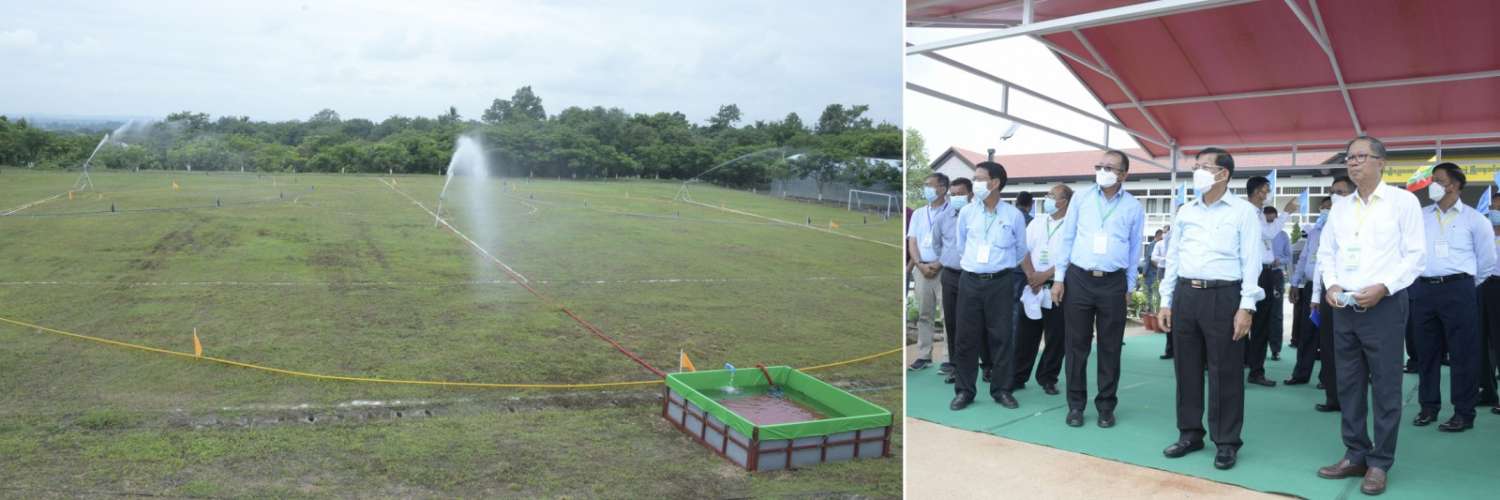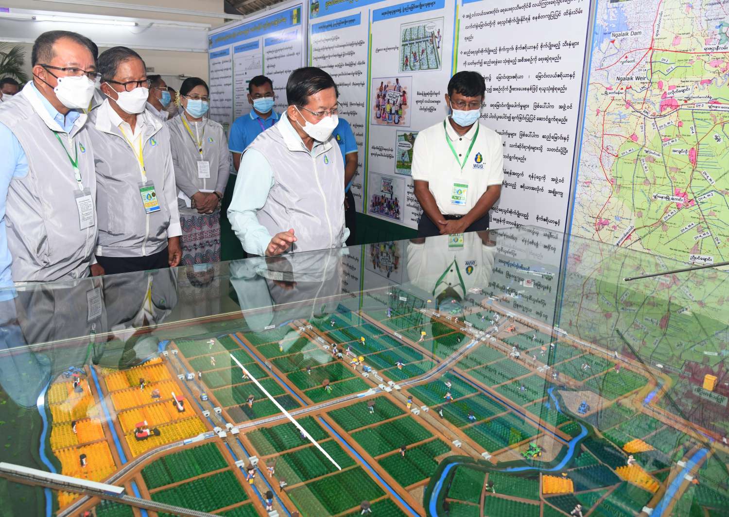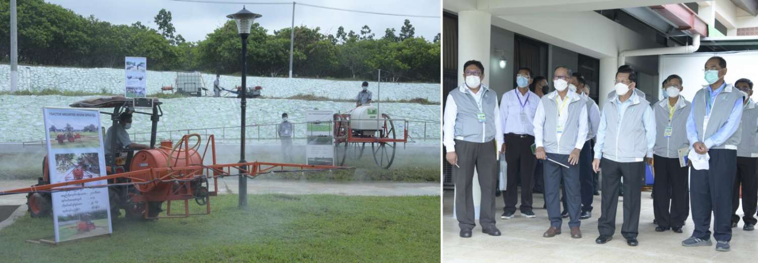 ယင်းနောက် နိုင်ငံတော်စီမံအုပ်ချုပ်ရေးကောင်စီဥက္ကဋ္ဌ နိုင်ငံတော်ဝန်ကြီးချုပ်နှင့် အဖွဲ့ဝင်များသည် အခမ်းအနားတက်ရောက်လာကြသည့် နိုင်ငံတစ်ဝန်းရှိ ရေအသုံးချသူများ အဖွဲ့ခေါင်းဆောင် တောင်သူများကို ရင်းရင်းနှီးနှီးနှုတ်ဆက်စကား ပြောကြားပြီး ဆည်မြောင်းနှင့်ရေအသုံးချမှု စီမံခန့်ခွဲရေးဦးစီးဌာန၏ ရေအသုံးချသူများအဖွဲ့ လှုပ်ရှားဆောင်ရွက်မှု မှတ်တမ်းပြခန်း၊ ငလိုက်ရေလှောင်တမံ ဆည်ရေသောက်စနစ်ပြခန်း၊ ဆည်မြောင်းပညာရပ်ဖွံ့ဖြိုးမှု လေ့ကျင့်ရေးသင်တန်းကျောင်းပြခန်း၊ ဘူမိဗေဒဌာနခွဲမှ မြေအောက်စူးစမ်းလေ့လာခြင်းလုပ်ငန်းများ ဆောင်ရွက်ရာတွင် အသုံးပြုသော စက်ကိရိယာများပြခန်း၊ ရေလှောင်တမံများ၏ အရေးပေါ်အခြေအနေ ကြိုတင်စီမံခန့်ခွဲမှု စီမံချက်ပြခန်း၊ နေရောင်ခြည်စွမ်းအင်သုံး အနိမ့်တင်၊ အမြင့်တင် ရေစုပ်စက်များဖြင့် ရေတင်ယူခြင်းပြကွက်၊ စက်မှုလယ်ယာဦးစီးဌာန၏ စက်မှုလယ်ယာစနစ်တကျ လယ်မြေဖော်ထုတ်ခြင်းလုပ်ငန်းပြခန်း၊ ပတ်လည်ရေဖျန်းစနစ်ဖြင့် စိုက်ခင်းများ ရေပေးဝေခြင်း ပြခန်း၊ မြန်မာနိုင်ငံ ဆန်စပါးအသင်းချုပ်နှင့် စိုက်ပျိုးရေး၊ မွေးမြူရေးနှင့် ဆည်မြောင်းဝန်ကြီးဌာနတို့ ပူးပေါင်းဆောင်ရွက်သည့် သဘာဝမြေဩဇာထုတ်လုပ်မှု ပြခန်းများနှင့် ပြင်ပပြကွက်များ၌ ရေစုပ်စက်ကိရိယာများ၊ ရေဖျန်းစက်ကိရိယာများ၊ လယ်ယာသုံးစက်ကိရိယာများ မြန်မာ့လယ်ယာသုံး စက်ကိရိယာစက်ရုံ(အင်းကုန်း) မှထုတ်လုပ်သည့် နေရောင်ခြည်စွမ်းအင်သုံးရေပန့် စနစ်၊ Head Mist Sprinkler ရေမှုန်ဖျန်းကိရိယာ Water Supply Flimpipe (Drip) ရေ အစက်ချကိရိယာ Rootzone Mini-Sprinkler အသေးစားအမြစ်ဇုန်ရေဖျန်းကိရိယာများ အသုံးပြု၍ သီးနှံများစိုက်ပျိုးထားရှိမှုများ၊ အမြင့်တင်နှင့် အနိမ့်တင် ရွေ့လျားဆိုလာစနစ်သုံး ရေတင်စနစ်၊ ရေစီးနှုန်းတိုင်းကိရိယာ Global Water Flow Probe ဖြင့် တိုင်းတာဆောင်ရွက်မှု၊ တူးမြောင်းများ အမျိုးအစားအလိုက် လိုင်နင်စီခြင်း သရုပ်ပြသထားမှုများ၊ ရေထိန်းညှိရေတံခါးများ တပ်ဆင်၍ ရေပေးဝေမှု သရုပ်ပြသမှုများနှင့် ရေသွင်းစနစ်ဖြင့် စိုက်ပျိုးထားသည့် မိုးစပါးစိုက်ခင်းများကို လှည့်လည်ကြည့်ရှု စစ်ဆေးရာ စိုက်ပျိုးရေး၊ မွေးမြူရေးနှင့်ဆည်မြောင်းဝန်ကြီးဌာန ပြည်ထောင်စုဝန်ကြီးနှင့် တာဝန်ရှိသူများက ရှင်းလင်းတင်ပြကြသည်။