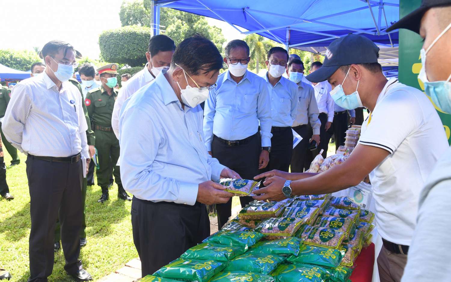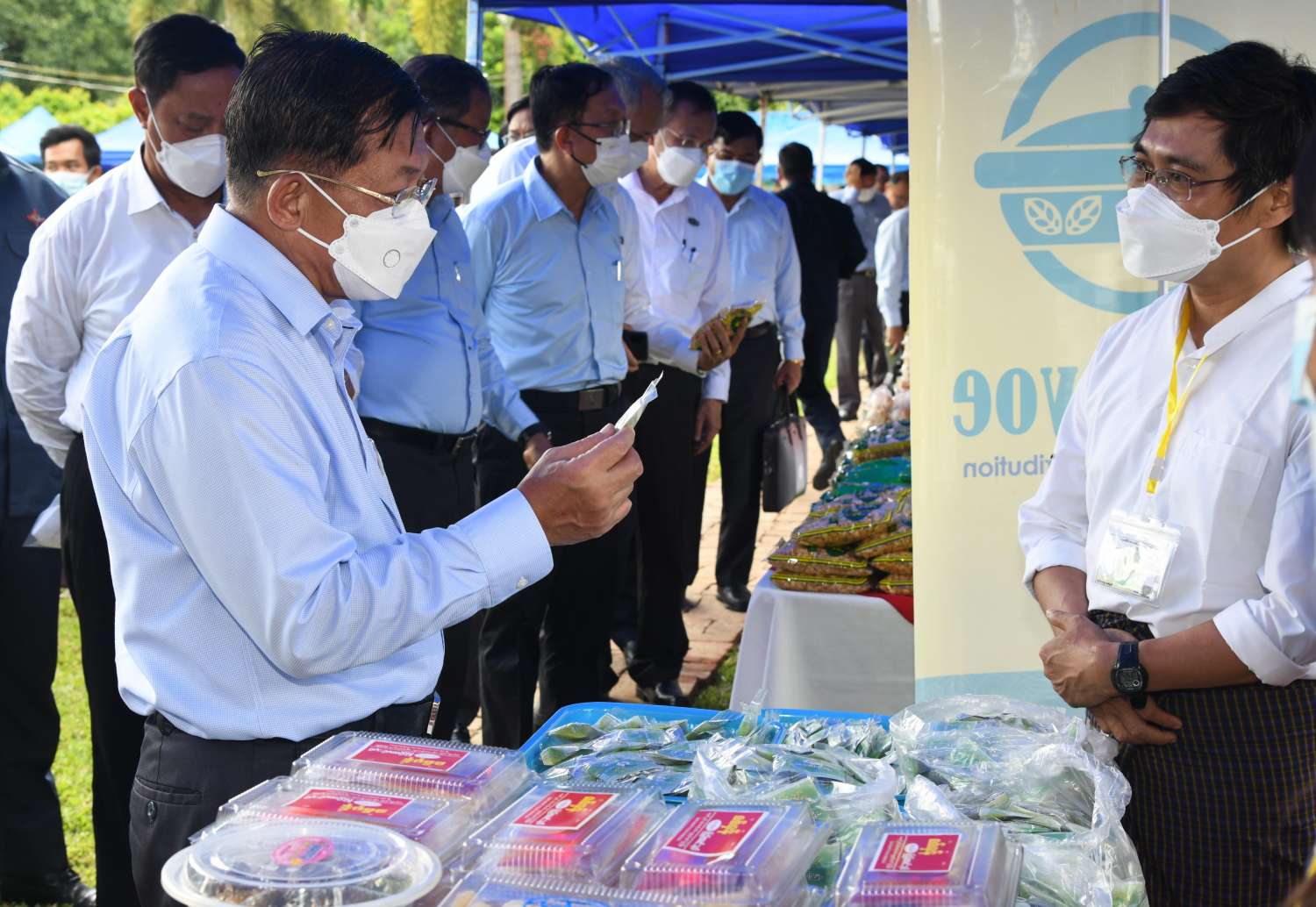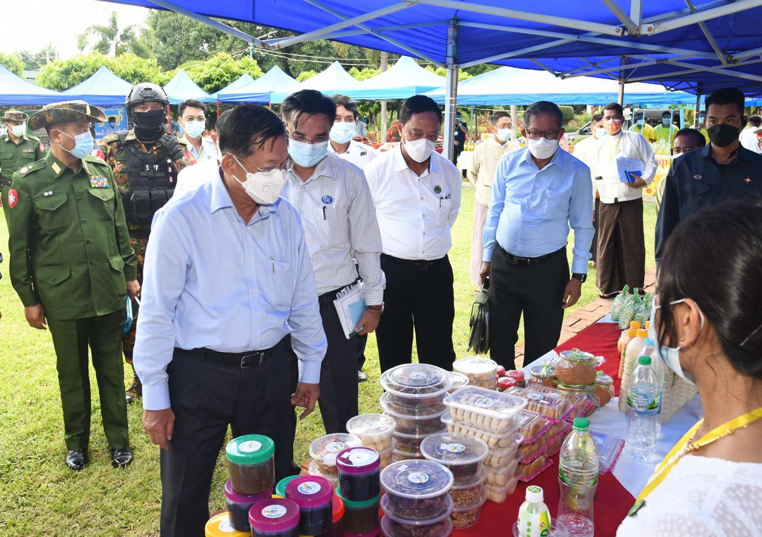 ထို့နောက် နိုင်ငံတော်စီမံအုပ်ချုပ်ရေးကောင်စီဥက္ကဋ္ဌ နိုင်ငံတော်ဝန်ကြီးချုပ်သည် ခင်းကျင်း ပြသထားသည့် စားသောက်ကုန်၊ လူသုံးကုန်၊ စက်မှုလက်မှုထုတ်ကုန်၊ မြန်မာ့ရိုးရာလက်မှု ထုတ်ကုန်များ၊ အဝတ်အထည်များ၊ တိုင်းရင်းဆေးများ စသည့် ထုတ်ကုန်ပစ္စည်းများ ခင်းကျင်း ပြသထားရှိမှုများကို ပြကွက်တစ်ခုချင်းစီအလိုက် စိတ်ဝင်တစားဖြင့် လေ့လာခဲ့ပြီး ဈေးကွက်ရရှိမှု အခြေအနေများကို မေးမြန်းဆွေးနွေးရာ လုပ်ငန်းအလိုက် စီးပွားရေးလုပ်ငန်းရှင်များက လိုက်လံရှင်းလင်းတင်ပြခဲ့ကြ ကြောင်း သတင်းရရှိသည်။