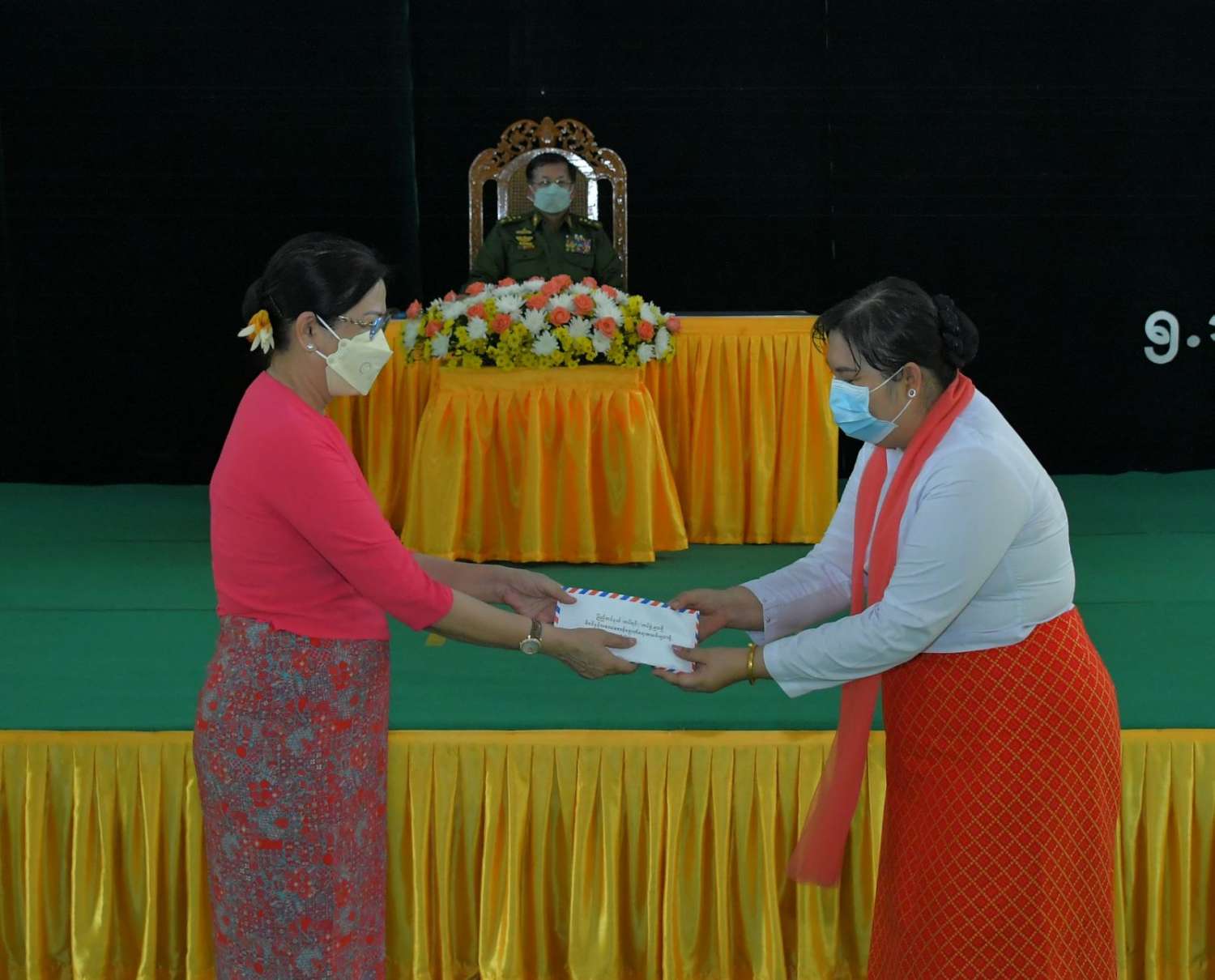 ထို့နောက် နိုင်ငံတော်စီမံအုပ်ချုပ်ရေးကောင်စီဥက္ကဋ္ဌ တပ်မတော်ကာကွယ်ရေးဦးစီးချုပ်က အရာရှိ၊ စစ်သည်၊ မိသားစုများအတွက် စားသောက်ဖွယ်ရာပစ္စည်းများကို ပေးအပ်ရာ ပြည်တပ်နယ်မှူးက လည်းကောင်း၊ နိုင်ငံတော်စီမံအုပ်ချုပ်ရေးကောင်စီဥက္ကဋ္ဌ တပ်မတော်ကာကွယ်ရေးဦးစီးချုပ်၏ ဇနီးက တပ်နယ်မိခင်နှင့် ကလေးစောင့်ရှောက်ရေးအသင်းအတွက် ချီးမြှင့်ငွေများကို ပေးအပ်ရာ ပြည်တပ်နယ်မှူး၏ ဇနီးကလည်းကောင်း အသီးသီး လက်ခံရယူကြသည်။ ယင်းနောက် ညှိနှိုင်းကွပ်ကဲရေးမှူး (ကြည်း၊ ရေ၊ လေ) ဗိုလ်ချုပ်ကြီး မောင်မောင်အေးက တပ်နယ်မှ အရာရှိ၊ စစ်သည်၊ မိသားစုများအတွက် သုတရသ စာအုပ်စာစောင်များကိုပေးအပ်ရာ ပန်းတောင်းတပ်နယ်မှူးက လက်ခံရယူသည်။