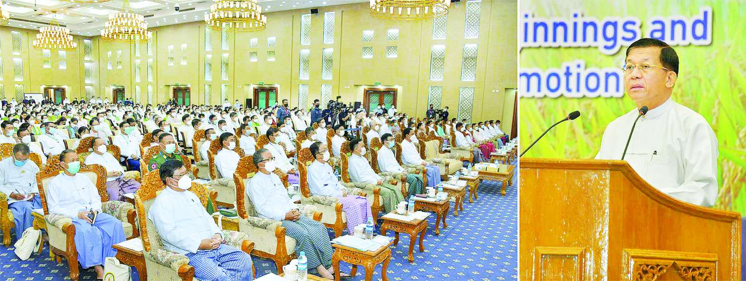 တင်ပြဆွေးနွေးမှုများအပေါ် နိုင်ငံတော် စီမံအုပ်ချုပ်ရေးကောင်စီ ဥက္ကဋ္ဌ နိုင်ငံတော်ဝန်ကြီးချုပ် ဗိုလ်ချုပ်မှူးကြီးမင်းအောင်လှိုင်က စိုက်ပျိုးရေး လုပ်ငန်းများ ဆောင်ရွက်ရာတွင် မျိုး၊ မြေ၊ ရေနှင့် နည်းပညာများ လိုအပ်မှု၊ မျိုးကောင်းမျိုးသန့်များ ရရှိရေးအတွက် နိုင်ငံတော်အစိုးရမှ ဆောင်ရွက်လျက်ရှိသကဲ့သို့ ပုဂ္ဂလိက ကဏ္ဍမှလည်း ကြိုးပမ်းဆောင်ရွက်ရန်လိုအပ်မှု၊ စိုက်ပျိုးမြေများကို စက်ကိရိယာများ အသုံးပြု စိုက်ပျိုးနိုင်ရေး အတွက် စနစ်တကျပြုပြင် ဆောင်ရွက်ရန်လိုအပ်မှု၊ ဓာတ်မြေဩဇာများ လုံလောက်စွာ ရရှိရေးအတွက် နိုင်ငံတော် အစိုးရမှ ကြိုးပမ်း ဆောင်ရွက်လျက်ရှိသကဲ့သို့ စိုက်ပျိုးတောင်သူများ အနေဖြင့်လည်း မွေးမြူရေး လုပ်ငန်းများမှ ထွက်ရှိလာသည့် ဇီဝမြေဩများကဲ့သို့သော သဘာဝ မြေဩဇာများကို အသုံးပြုဆောင်ရွက်ရန် လိုအပ်မှု၊ စိုက်ပျိုးရေနှင့် အောင်ရေများ လုံလောက်စွာရရှိရေးအတွက် မြစ်ရေတင် လုပ်ငန်းများကို အကောင်အထည်ဖော် ဆောင်ရွက်ရန် လိုအပ်မှု၊ ဆန်စပါးများ အရည်အသွေးပြည့်မီစွာ ထုတ်လုပ်၍ ပြည်တွင်းဈေးကွက်နှင့် ပြည်ပဈေးကွက်များသို့ ရောင်းချနိုင်ရေး ဈေးကွက် ရှာဖွေခြင်းနှင့် ဈေးကွက် ထိန်းသိမ်းခြင်း လုပ်ငန်းများ ဆောင်ရွက်ရန် လိုအပ်မှု၊ ဆန်စပါး စိုက်ပျိုးထုတ်လုပ်မှု ဖွံ့ဖြိုးတိုးတက်ရေးအတွက် နိုင်ငံတော်မှ အားပေးပံ့ပိုး ကူညီဆောင်ရွက်ပေးနေမှု အခြေအနေများနှင့် စပ်လျဉ်း၍ အကျယ်တဝံ့ ရှင်းလင်း ပြောကြားသည်။