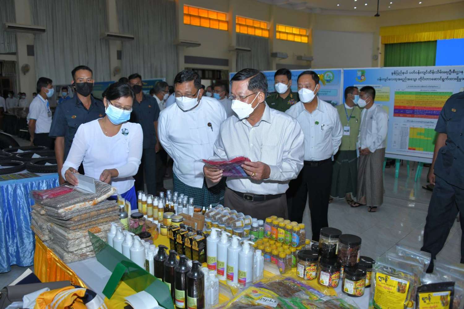 ထို့နောက် နိုင်ငံတော်စီမံအုပ်ချုပ်ရေးကောင်စီဥက္ကဋ္ဌ နိုင်ငံတော်ဝန်ကြီးချုပ်သည် ခင်းကျင်းပြသထားသည့် စားသောက်ကုန်၊ လူသုံးကုန်၊ စက်မှုလက်မှုထုတ်ကုန်၊ ဒေသရိုးရာလက်မှုထုတ်ကုန်များ၊ အဝတ်အထည်များ၊ တိုင်းရင်းဆေးများ စသည့် ထုတ်ကုန်ပစ္စည်းများ ခင်းကျင်းပြသထားရှိမှုများကို ပြကွက်တစ်ခုချင်းစီအလိုက် စိတ်ဝင်တစားဖြင့်လေ့လာခဲ့ပြီး ဈေးကွက်ရရှိမှုအခြေအနေများကို မေးမြန်းဆွေးနွေးရာ လုပ်ငန်းအလိုက် စီးပွားရေးလုပ်ငန်းရှင်များက လိုက်လံရှင်းလင်းတင်ပြခဲ့ကြကြောင်း သတင်းရရှိသည်။