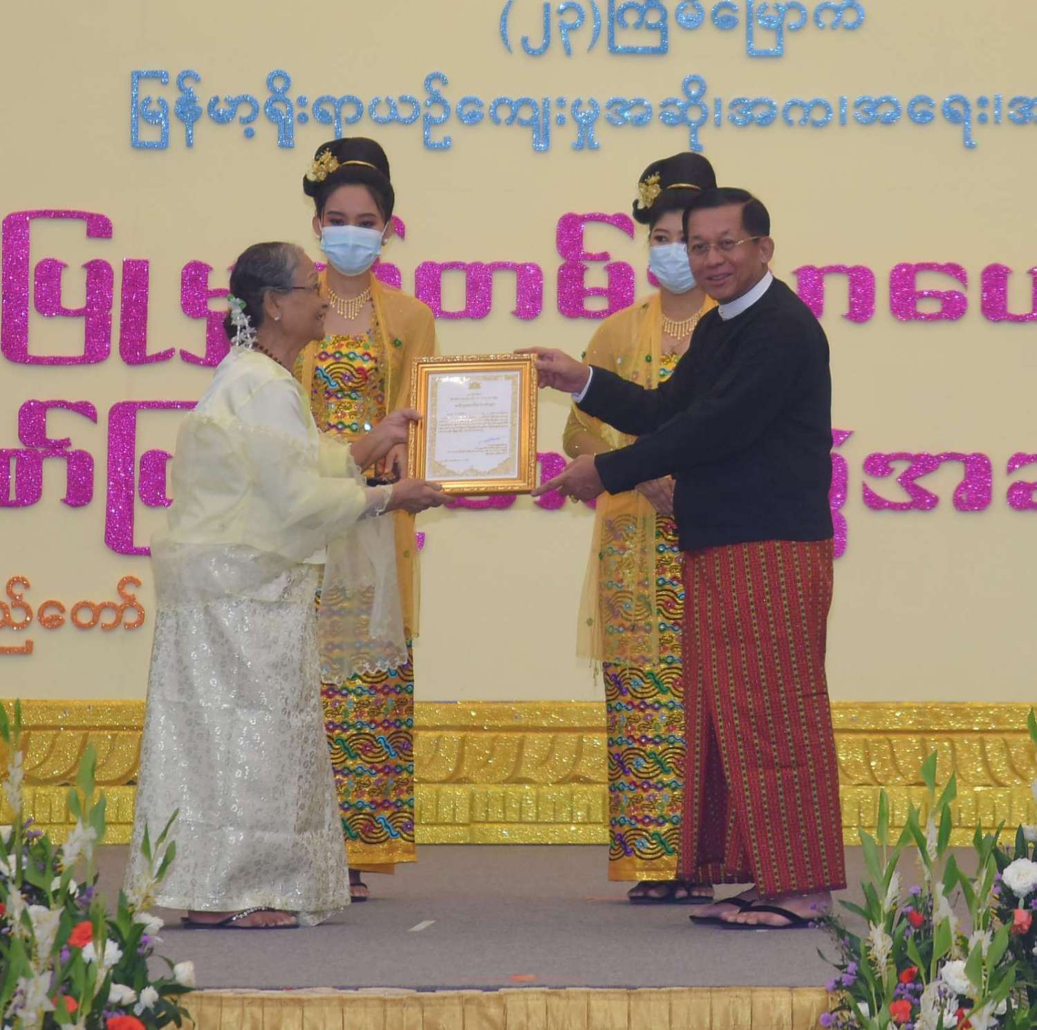 ယင်းနောက် နိုင်ငံတော်စီမံအုပ်ချုပ်ရေးကောင်စီဥက္ကဋ္ဌ နိုင်ငံတော်ဝန်ကြီးချုပ်က အဆိုအကဲဖြတ်လုပ်ငန်းအဖွဲ့ကိုယ်စား ဥက္ကဋ္ဌဒေါ်သင်းသင်းမြတ်၊ အကအကဲဖြတ်လုပ်ငန်းအဖွဲ့ကိုယ်စား ဥက္ကဋ္ဌဦးအောင်တင်ဝင်း၊ အရေးအကဲဖြတ်လုပ်ငန်းအဖွဲ့ကိုယ်စား အတွင်းရေးမှူး ဦးမင်းယုနှင့် အတီးအကဲဖြတ်လုပ်ငန်းအဖွဲ့ကိုယ်စား ဥက္ကဋ္ဌဦးအောင်ကိန်းတို့ကိုလည်းကောင်း၊ ပြိုင်ပွဲကျင်းပရေး ဦးစီးကော်မတီနာယက ကောင်စီဒုတိယဥက္ကဋ္ဌ ဒုတိယဝန်ကြီးချုပ် ဒုတိယဗိုလ်ချုပ်မှူးကြီးစိုးဝင်းက တိုင်းဒေသကြီးနှင့် ပြည်နယ်များမှ အုပ်ချုပ်သူများနှင့် အခမ်းအနားမှူးများကိုလည်းကောင်း ဂုဏ်ပြုမှတ်တမ်းလွှာများ ပေးအပ်ချီးမြှင့်ကြသည်။