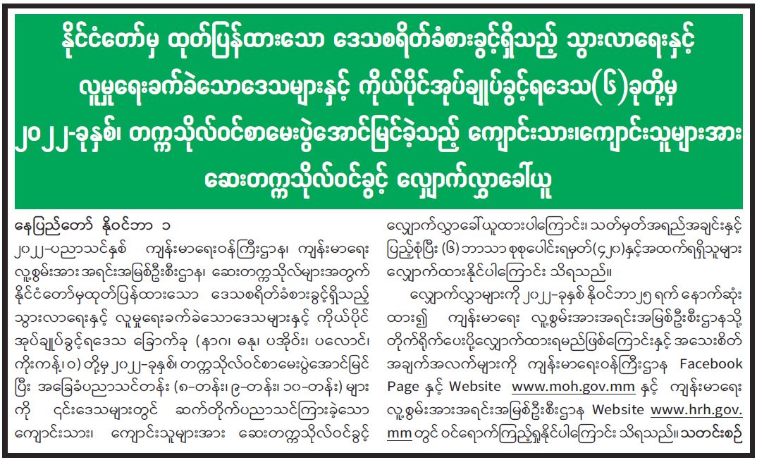 နိုင်ငံတော်မှ ထုတ်ပြန်ထားသော ဒေသစရိတ်ခံစားခွင့်ရှိသည့် သွားလာရေးနှင့် လူမှုရေးခက်ခဲသောဒေသများနှင့် ကိုယ်ပိုင်အုပ်ချုပ်ခွင့်ရဒေသ(၆)ခုတို့မှ ၂၀၂၂-ခုနှစ်၊ တက္ကသိုလ်ဝင်စာမေးပွဲအောင်မြင်ခဲ့သည့် ကျောင်းသား၊ ကျောင်းသူများအား ဆေးတက္ကသိုလ်ဝင်ခွင့် လျှောက်လွှာခေါ်ယူ