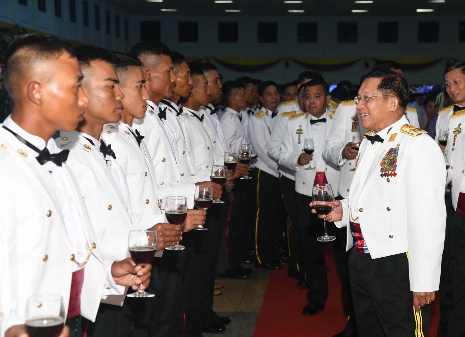 ဦးစွာ နိုင်ငံတော်စီမံအုပ်ချုပ်ရေးကောင်စီဥက္ကဋ္ဌ တပ်မတော်ကာကွယ်ရေးဦးစီးချုပ်က သင်တန်းဆင်းအရာရှိများအား တစ်ဦးချင်း ရင်းရင်းနှီးနှီး လိုက်လံနှုတ်ဆက်သည်။ ထို့နောက် နိုင်ငံတော်စီမံအုပ်ချုပ်ရေးကောင်စီဥက္ကဋ္ဌ တပ်မတော်ကာကွယ်ရေးဦးစီးချုပ်နှင့် အဖွဲ့ဝင်များသည် သင်တန်းဆင်း အရာရှိများ၊ ညစာစားပွဲ တက်ရောက်လာကြသူများနှင့်အတူ ဂုဏ်ပြုညစာကို အတူတကွ သုံးဆောင်ကြသည်။